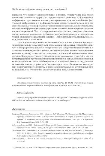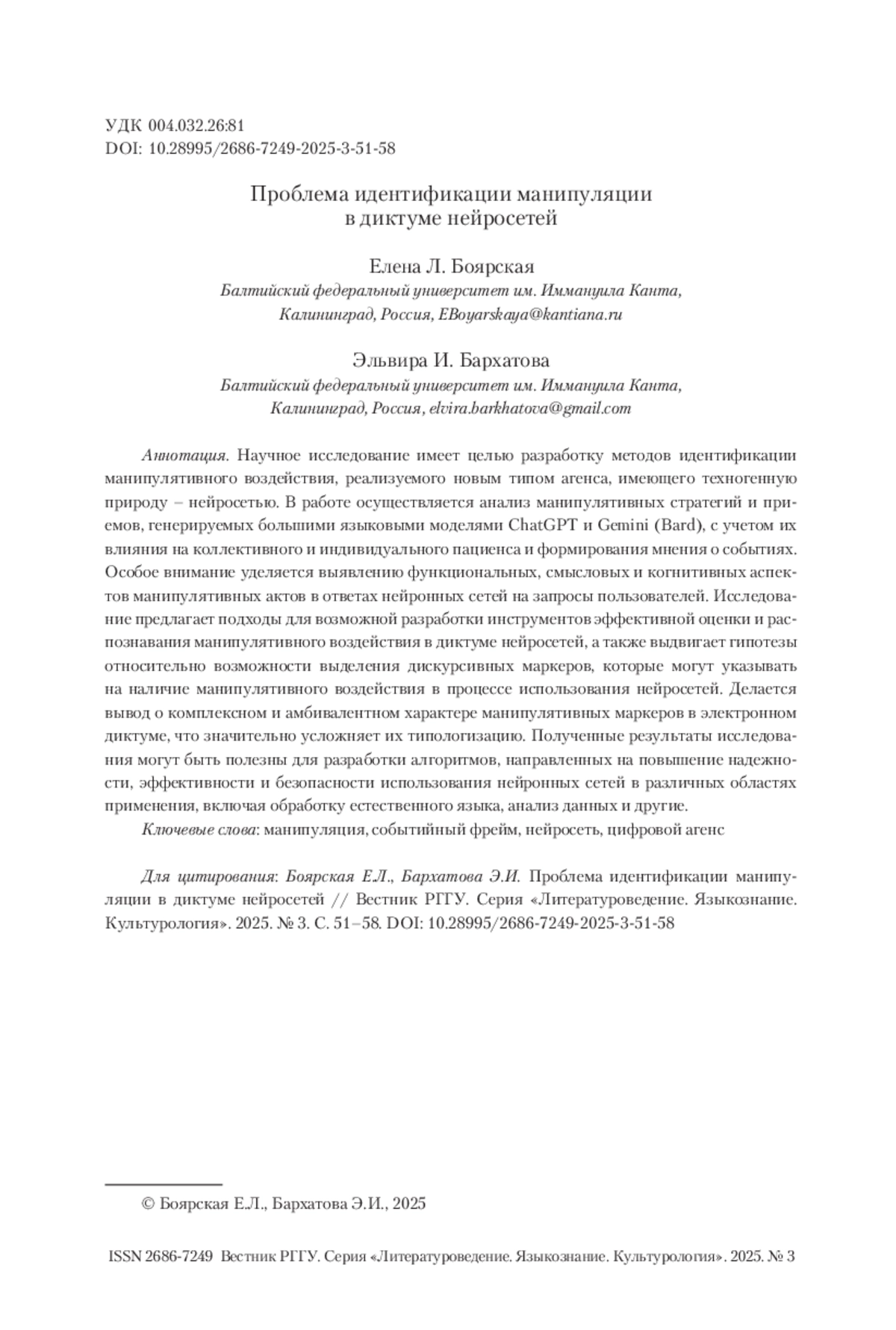 Научное исследование имеет целью разработку методов идентификации манипулятивного воздействия, реализуемого новым типом агенса, имеющего техногенную природу – нейросетью. В работе осуществляется анализ манипулятивных стратегий и приемов, генерируемых большими языковыми моделями ChatGPT и Gemini (Bard), с учетом их влияния на коллективного и индивидуального пациенса и формирования мнения о событиях. Особое внимание уделяется выявлению функциональных, смысловых и когнитивных аспектов манипулятивных актов в ответах нейронных сетей на запросы пользователей. Исследование предлагает подходы для возможной разработки инструментов эффективной оценки и распознавания манипулятивного воздействия в диктуме нейросетей, а также выдвигает гипотезы относительно возможности выделения дискурсивных маркеров, которые могут указывать на наличие манипулятивного воздействия в процессе использования нейросетей. Делается вывод о комплексном и амбивалентном характере манипулятивных маркеров в электронном диктуме, что значительно усложняет их типологизацию. Полученные результаты исследования могут быть полезны для разработки алгоритмов, направленных на повышение надежности, эффективности и безопасности использования нейронных сетей в различных областях применения, включая обработку естественного языка, анализ данных и другие.