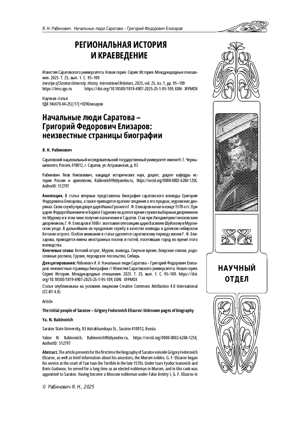 27. Рабинович Я. Н. История первоначального Саратова 1590-1604 годов: характеристика источников и хронология событий (до начала Смутного времени) // Известия Саратовского университета. Новая серия. Серия: История. Международные отношения. 2016. Т. 16, вып. 1. С. 80-87. DOI: 10.18500/1819-4907-2016-16-1-80-87 EDN: VUTTAP
