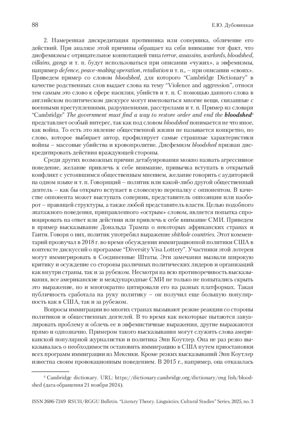 Данное исследование рассматривает дисфемизацию эвфемистических единиц как средство манипулирования общественным сознанием. Целью исследования является выявление факторов, влияющих на изменение коннотации эвфемистических единиц в дискурсе социальных сетей. В ходе исследования выдвинута гипотеза о триггерах (предпосылках) превращения эвфемизма в дисфемизм. Удалось выделить три самых продуктивных дискурсивных механизма формирования семантики амбивалентных эвфемистических единиц, а именно: 1) реализацию метафорических и метонимических концептуальных моделей; 2) нивелирование эвфемистического эффекта путем экспликации или использования синонима; 3) использование языковых единиц, характеризующихся амбивалентной коннотацией наряду с эвфемизмом. В процессе исследования были также описаны пять концептуальных моделей формирования фонда дисфемистических единиц в дискурсе социальных сетей. Сделан вывод о роли дисфемизации в процессе манипуляции общественным сознанием. На основе полученных результатов можно рассматривать дисфемизацию эвфемистических единиц как эффективный инструмент воздействия на общественное сознание и формирования определенного мнения о событиях или явлениях. Данное исследование позволяет более глубоко понять процессы манипуляции языком и выявить механизмы, с помощью которых происходит изменение коннотации слов и выражений в дискурсе социальных сетей.
