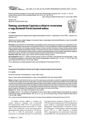 Статья: ПОМОЩЬ НАСЕЛЕНИЯ САРАТОВА И ОБЛАСТИ ГОСПИТАЛЯМ В ГОДЫ ВЕЛИКОЙ ОТЕЧЕСТВЕННОЙ ВОЙНЫ (2025)