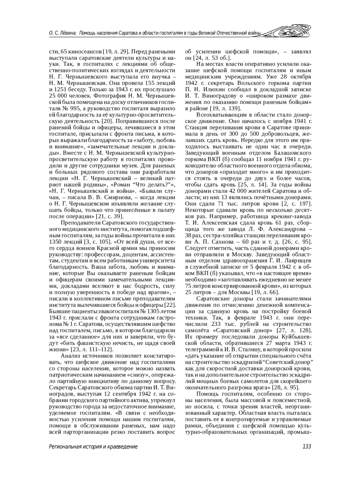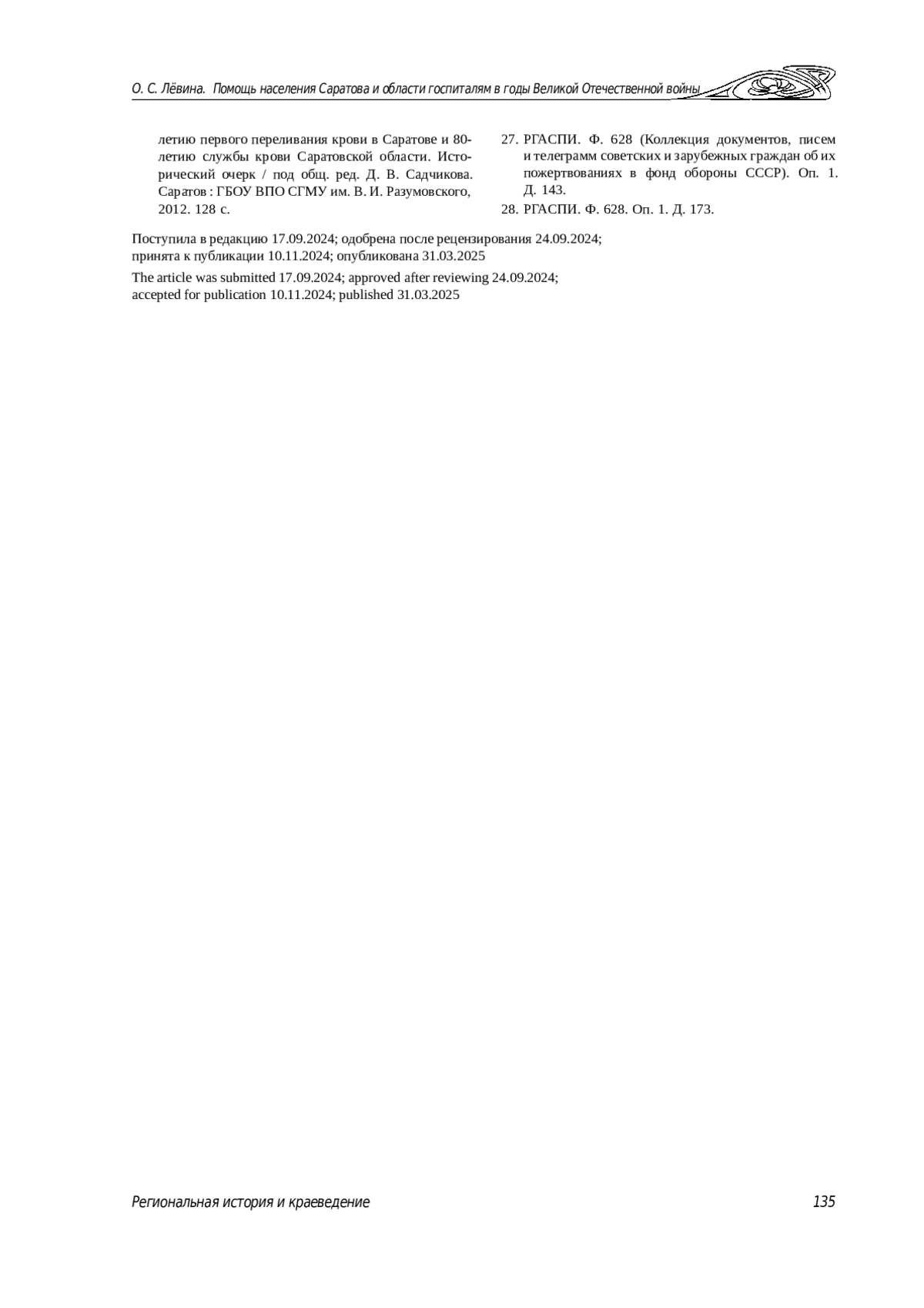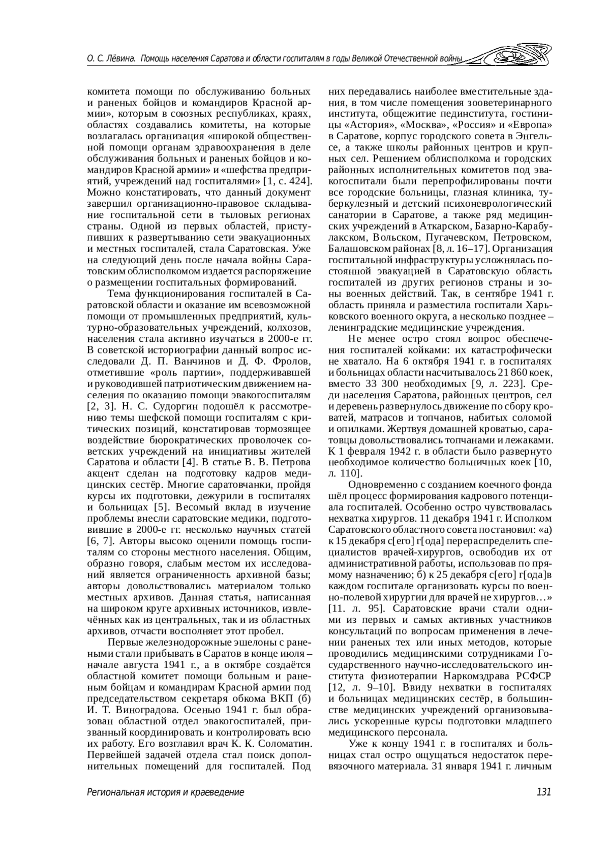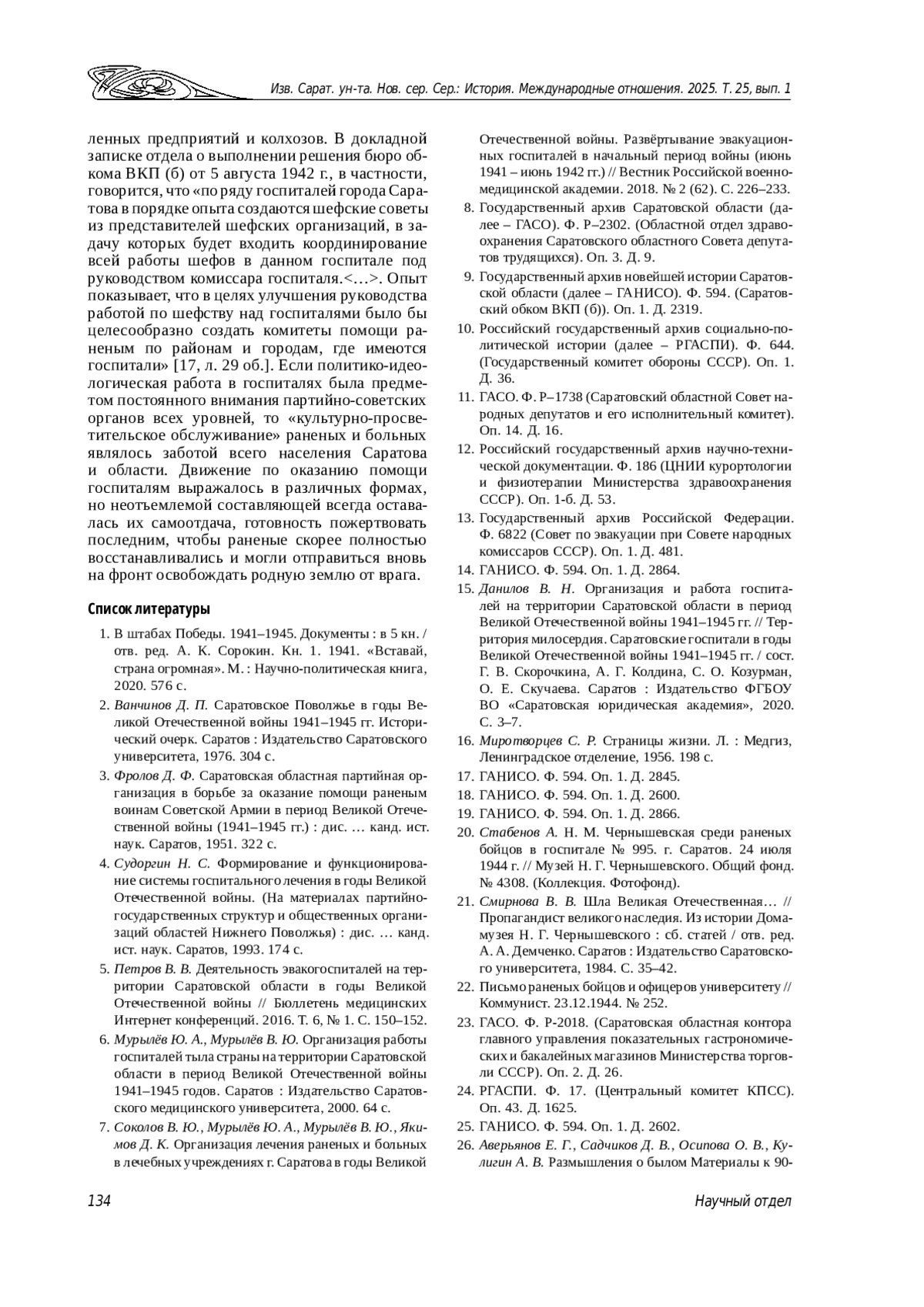 ЛЕВИНА О. С. ПОМОЩЬ НАСЕЛЕНИЯ САРАТОВА И ОБЛАСТИ ГОСПИТАЛЯМ В ГОДЫ ВЕЛИКОЙ ОТЕЧЕСТВЕННОЙ ВОЙНЫ // ИЗВЕСТИЯ САРАТОВСКОГО УНИВЕРСИТЕТА. НОВАЯ СЕРИЯ. СЕРИЯ: ИСТОРИЯ. МЕЖДУНАРОДНЫЕ ОТНОШЕНИЯ. 2025. Т. 25 № 1