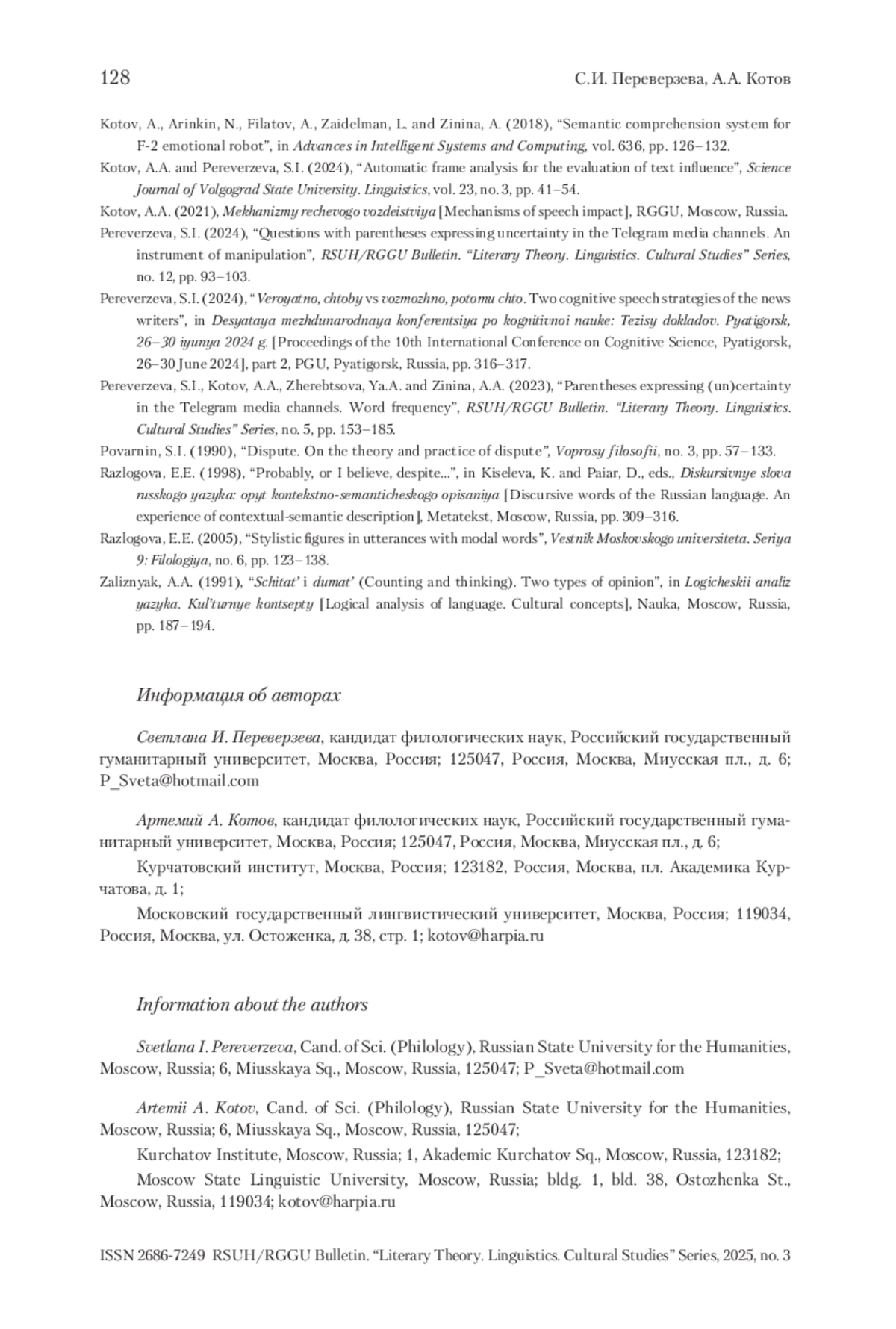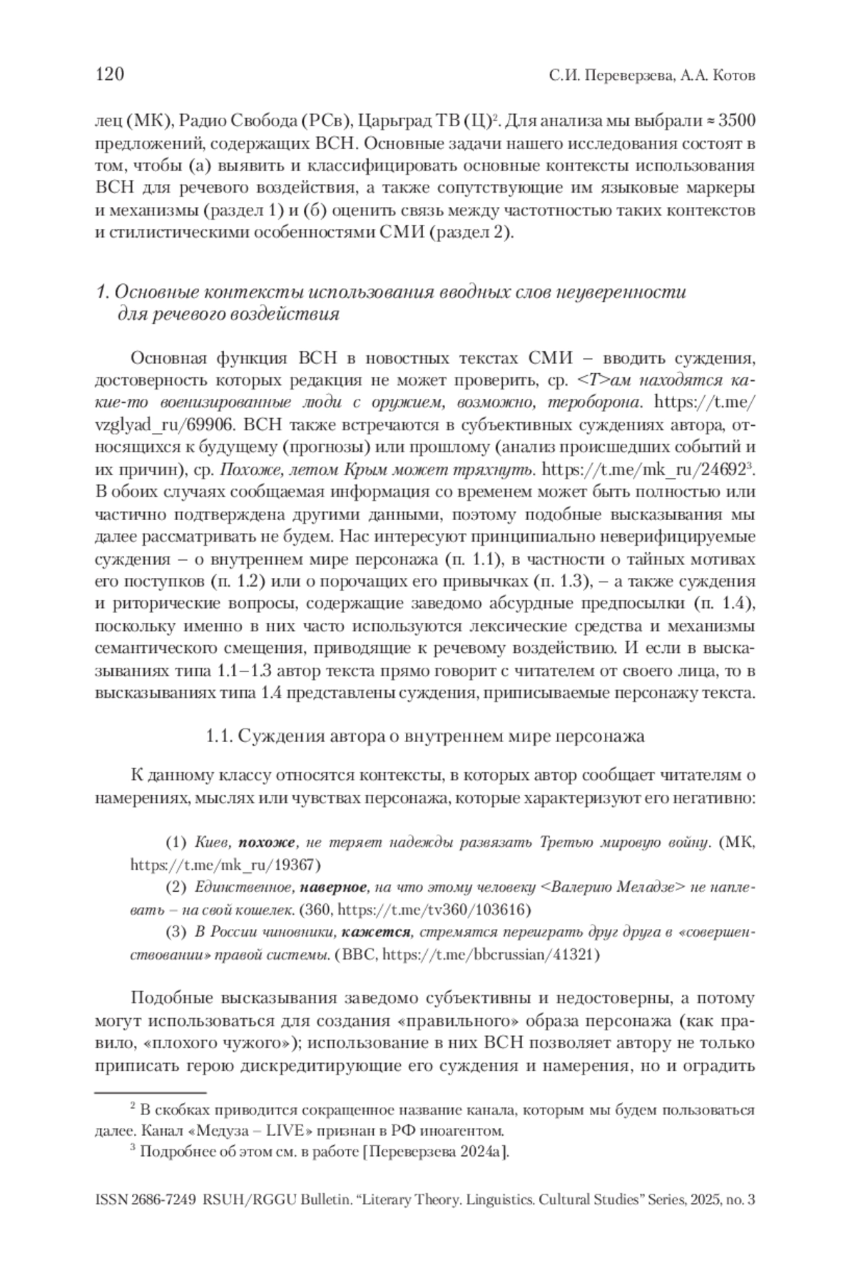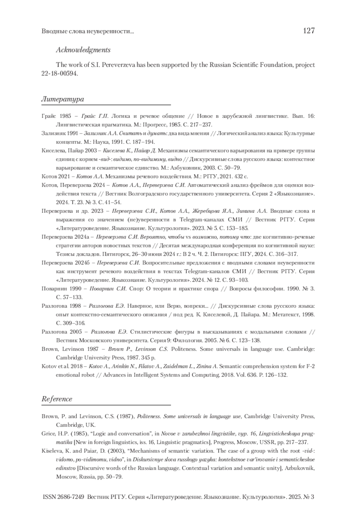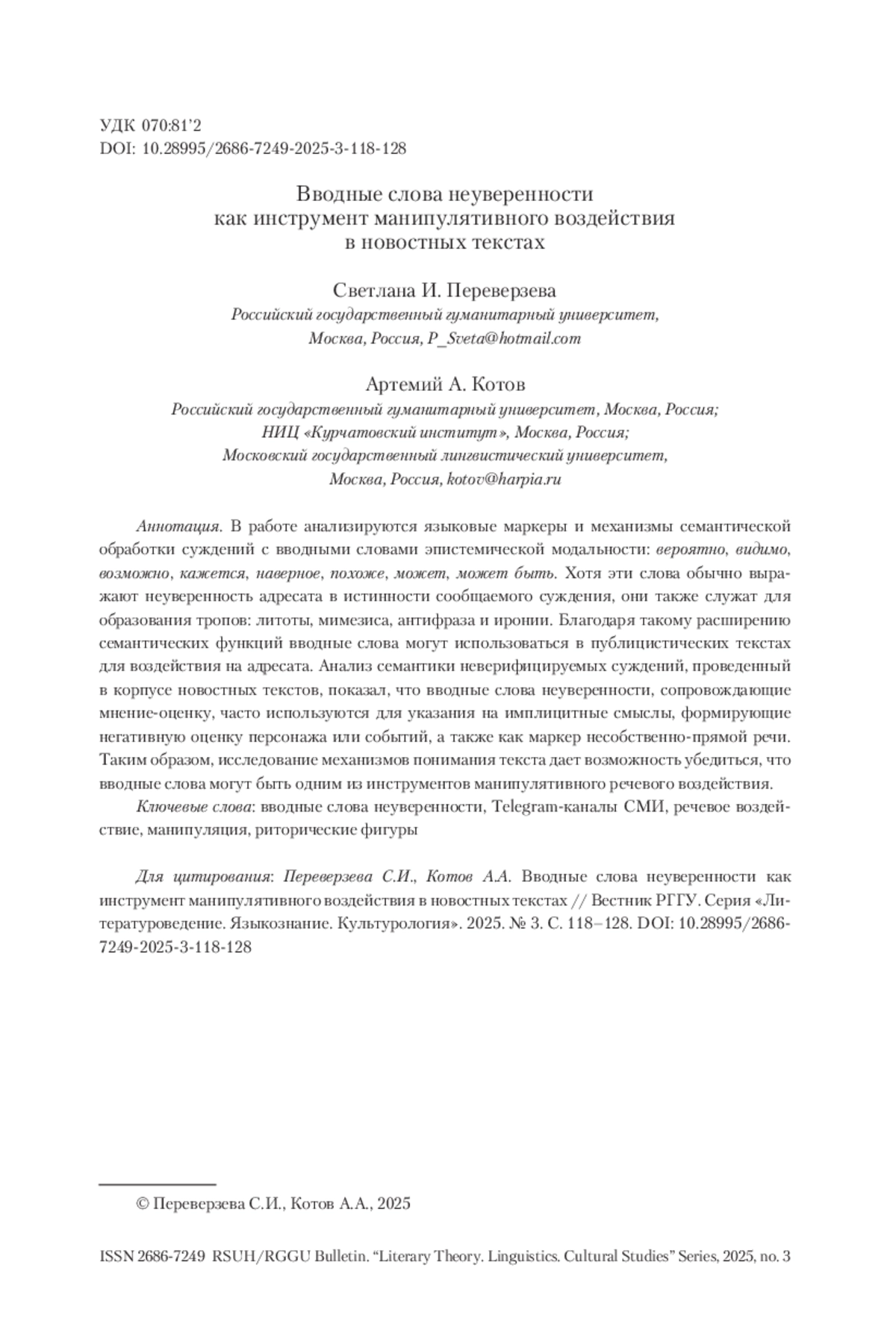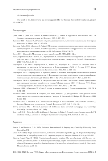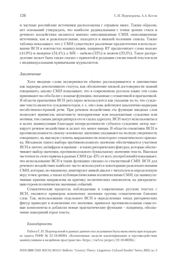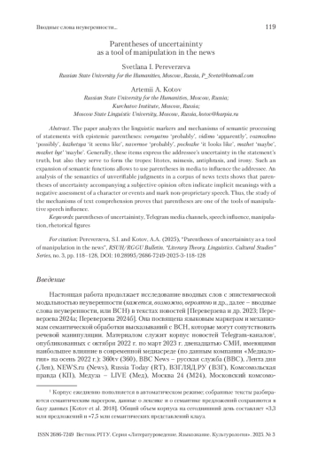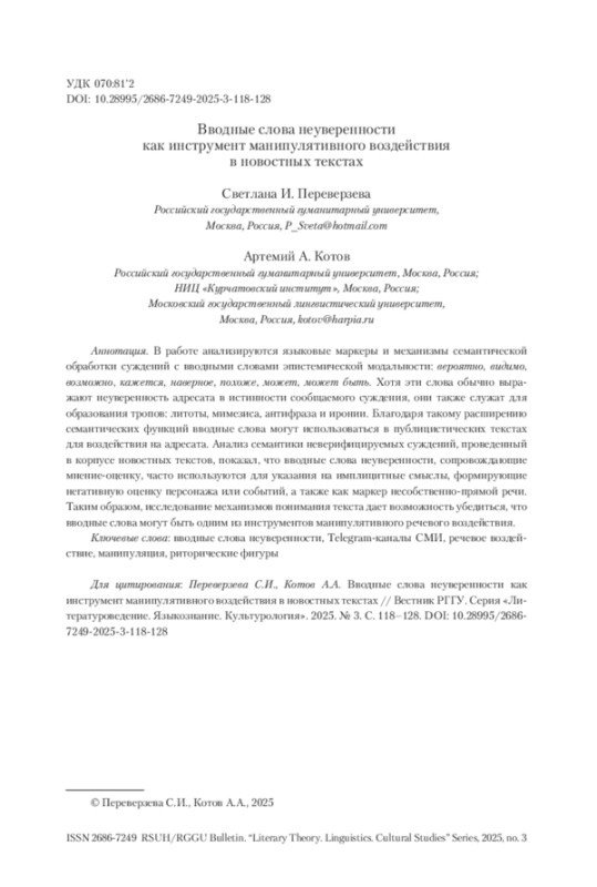 6. Переверзева и др. 2023 - Переверзева С.И., Котов А.А., Жеребцова Я.А., Зинина А.А. Вводные слова и выражения со значением (не)уверенности в Telegram-каналах СМИ // Вестник РГГУ. Серия «Литературоведение. Языкознание. Культурология». 2023. № 5. С. 153-185.