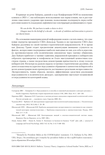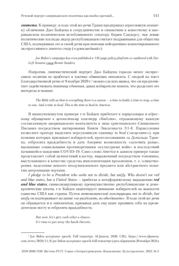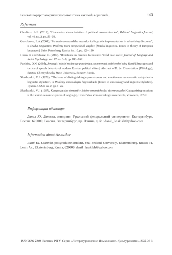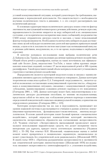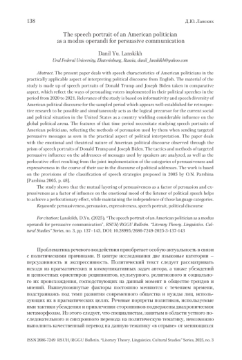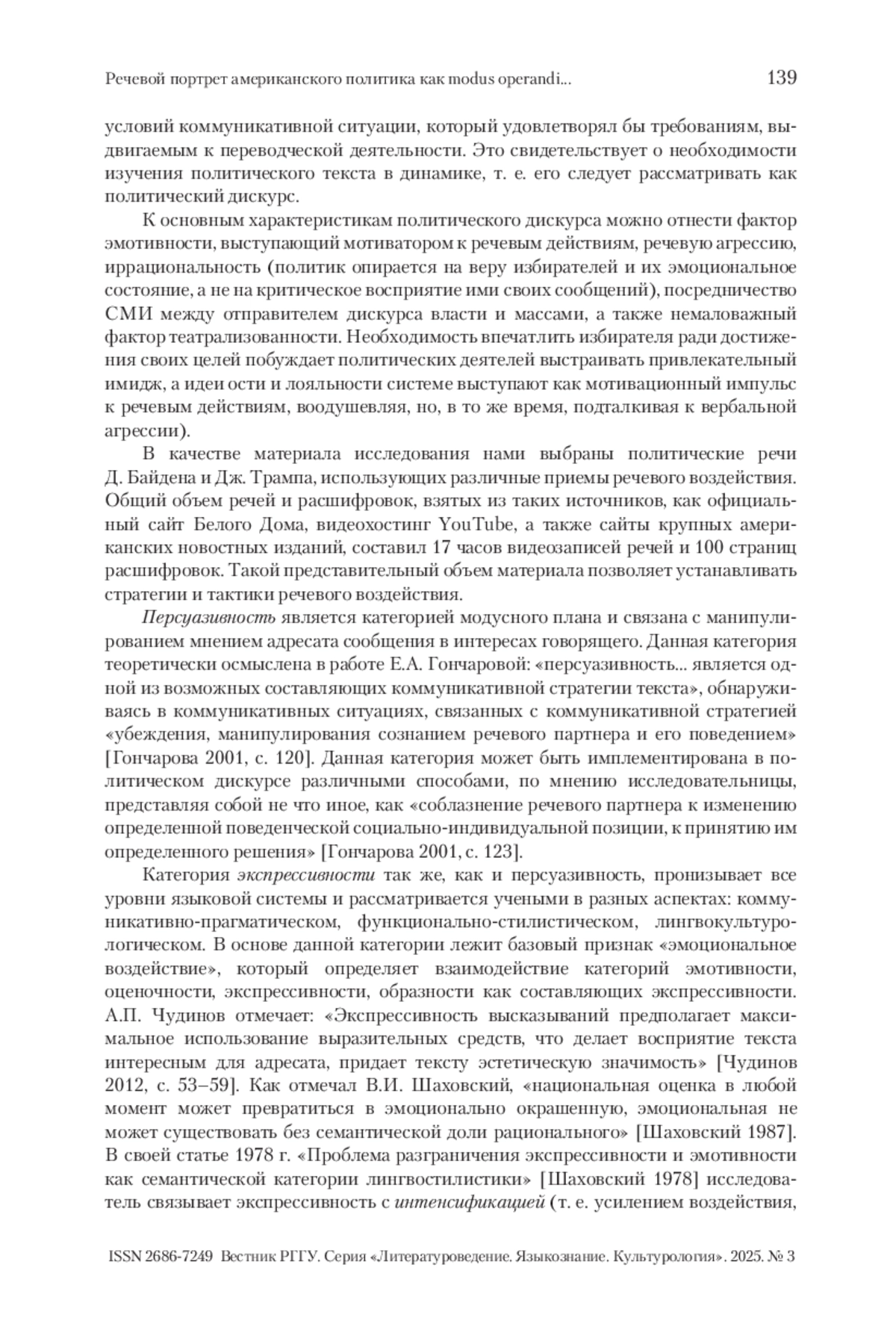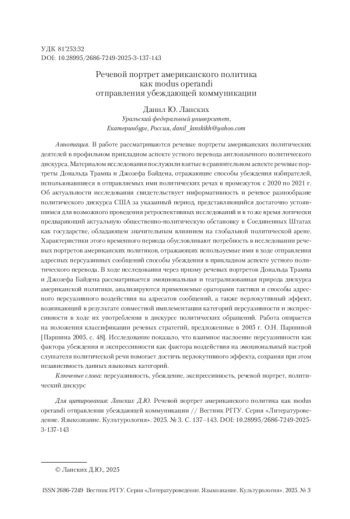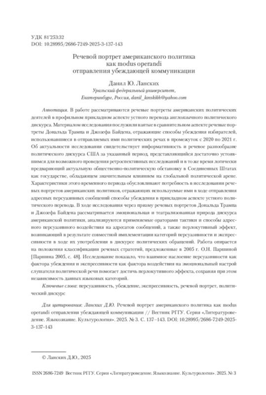 ЛАНСКИХ Д. Ю. РЕЧЕВОЙ ПОРТРЕТ АМЕРИКАНСКОГО ПОЛИТИКА КАК MODUS OPERANDI ОТПРАВЛЕНИЯ УБЕЖДАЮЩЕЙ КОММУНИКАЦИИ // ВЕСТНИК РГГУ. СЕРИЯ «ЛИТЕРАТУРОВЕДЕНИЕ. ЯЗЫКОЗНАНИЕ. КУЛЬТУРОЛОГИЯ». 2025. № 3