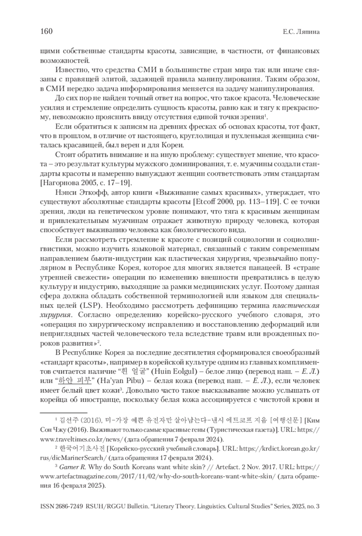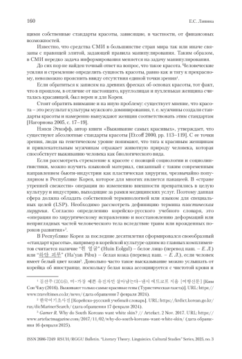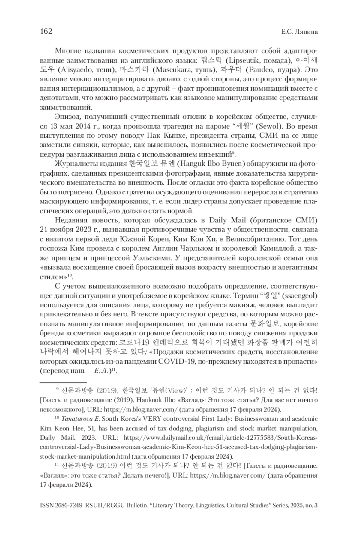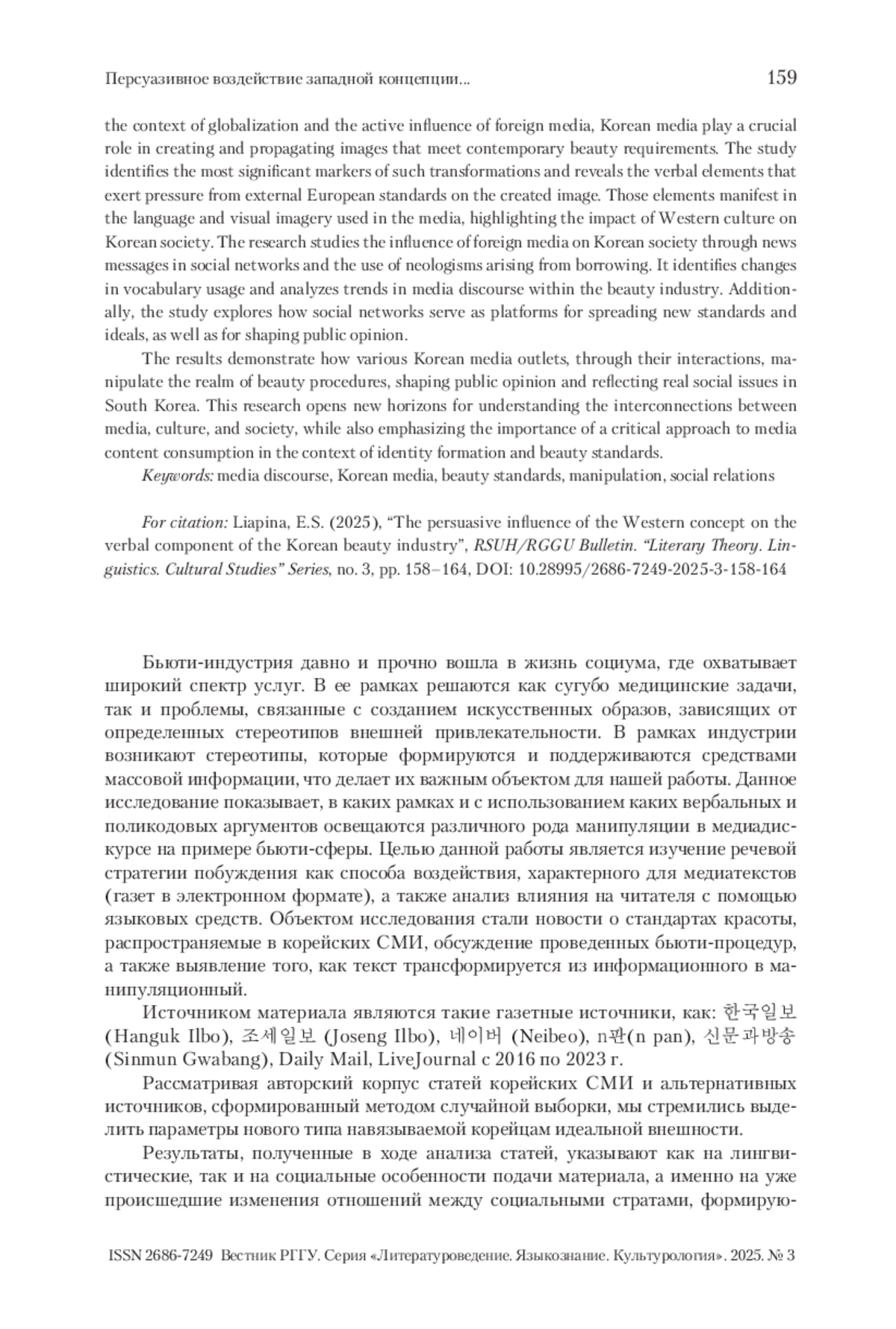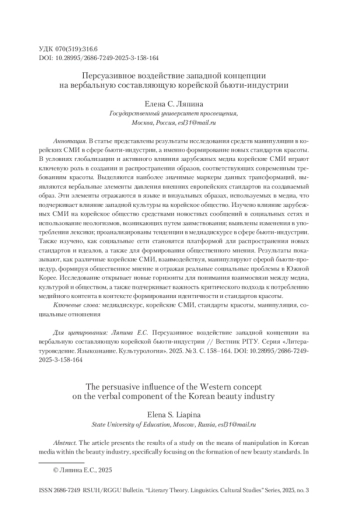 В статье представлены результаты исследования средств манипуляции в корейских СМИ в сфере бьюти-индустрии, а именно формирование новых стандартов красоты. В условиях глобализации и активного влияния зарубежных медиа корейские СМИ играют ключевую роль в создании и распространении образов, соответствующих современным требованиям красоты. Выделяются наиболее значимые маркеры данных трансформаций, выявляются вербальные элементы давления внешних европейских стандартов на создаваемый образ. Эти элементы отражаются в языке и визуальных образах, используемых в медиа, что подчеркивает влияние западной культуры на корейское общество. Изучено влияние зарубежных СМИ на корейское общество средствами новостных сообщений в социальных сетях и использование неологизмов, возникающих путем заимствования; выявлены изменения в употреблении лексики; проанализированы тенденции в медиадискурсе в сфере бьюти-индустрии. Также изучено, как социальные сети становятся платформой для распространения новых стандартов и идеалов, а также для формирования общественного мнения. Результаты показывают, как различные корейские СМИ, взаимодействуя, манипулируют сферой бьюти-процедур, формируя общественное мнение и отражая реальные социальные проблемы в Южной Корее. Исследование открывает новые горизонты для понимания взаимосвязи между медиа, культурой и обществом, а также подчеркивает важность критического подхода к потреблению медийного контента в контексте формирования идентичности и стандартов красоты.