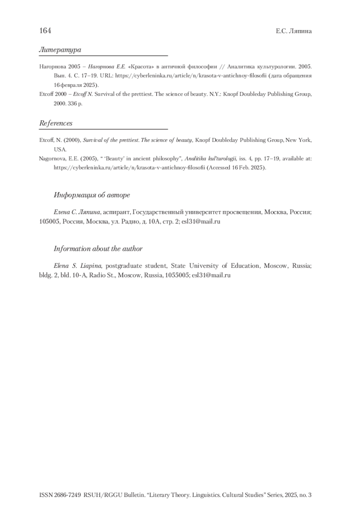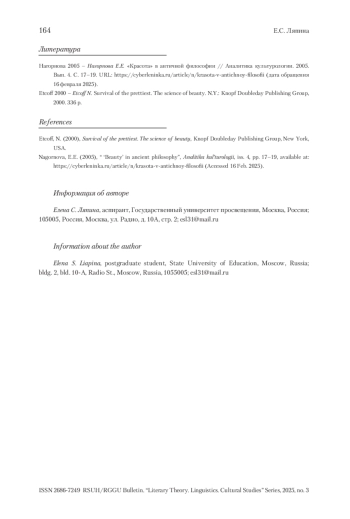 1. Нагорнова 2005 - Нагорнова Е.Е. «Красота» в античной философии // Аналитика культурологии. 2005. Вып. 4. С. 17-19. URL: https://cyberleninka.ru/article/n/krasota-v-antichnoy-filosofii (дата обращения 16 февраля 2025).