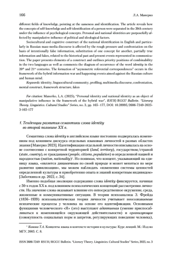 Термин identity (идентичность), сформировавшийся в английском языке в XVII столетии, все время переосмыслялся под влиянием дискурса отдельных языковых личностей в разных областях знания, указывая на тождество и ее самоидентификацию. В статье раскрывается то, как в XX в. под влиянием психологических концепций разведены понятия самопознания и самоидентификации личности. Идентичность личности и нации подвергаются целенаправленному манипулятивному воздействию под влиянием политико-идеологических факторов.
