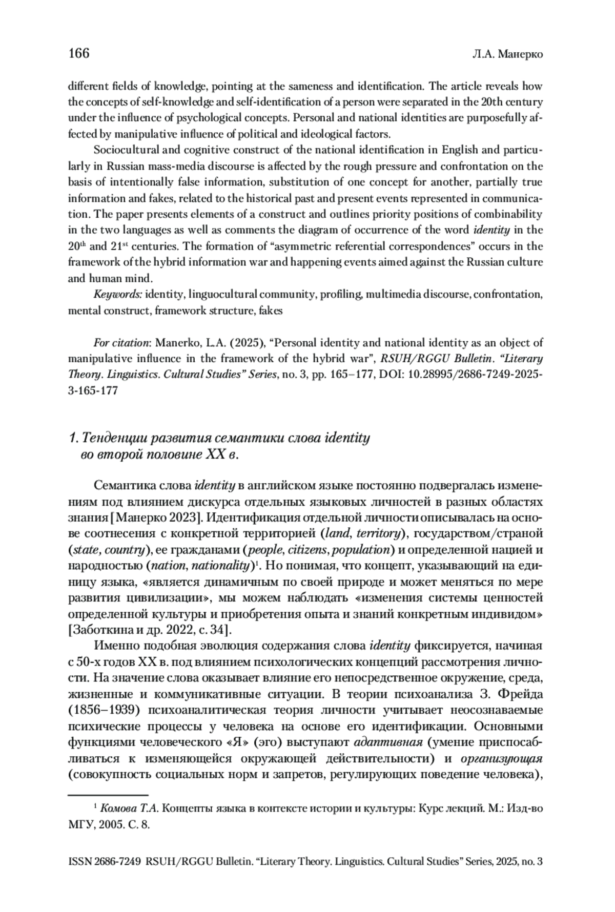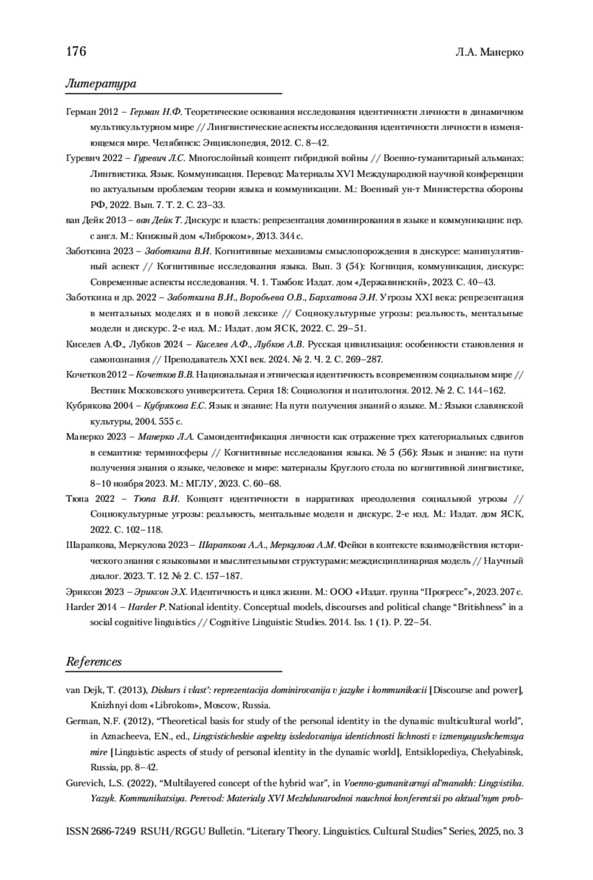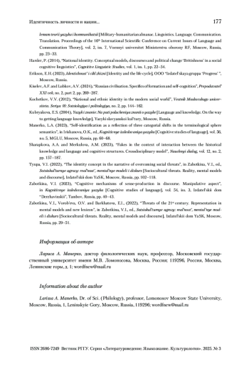 9. Манерко 2023 - Манерко Л.А. Самоидентификация личности как отражение трех категориальных сдвигов в семантике терминосферы // Когнитивные исследования языка. № 5 (56): Язык и знание: на пути получения знания о языке, человеке и мире: материалы Круглого стола по когнитивной лингвистике, 8-10 ноября 2023. М.: МГЛУ, 2023. С. 60-68.