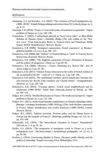 30. Якубова 2020 - Якубова Л.А. Особенности французской модели интеграции мигрантов в контексте социального развития единой Европы во второй половине XX - начале XXI в. // Вестник Нижневартовского государственного университета. 2020. № 4. С. 35-41.