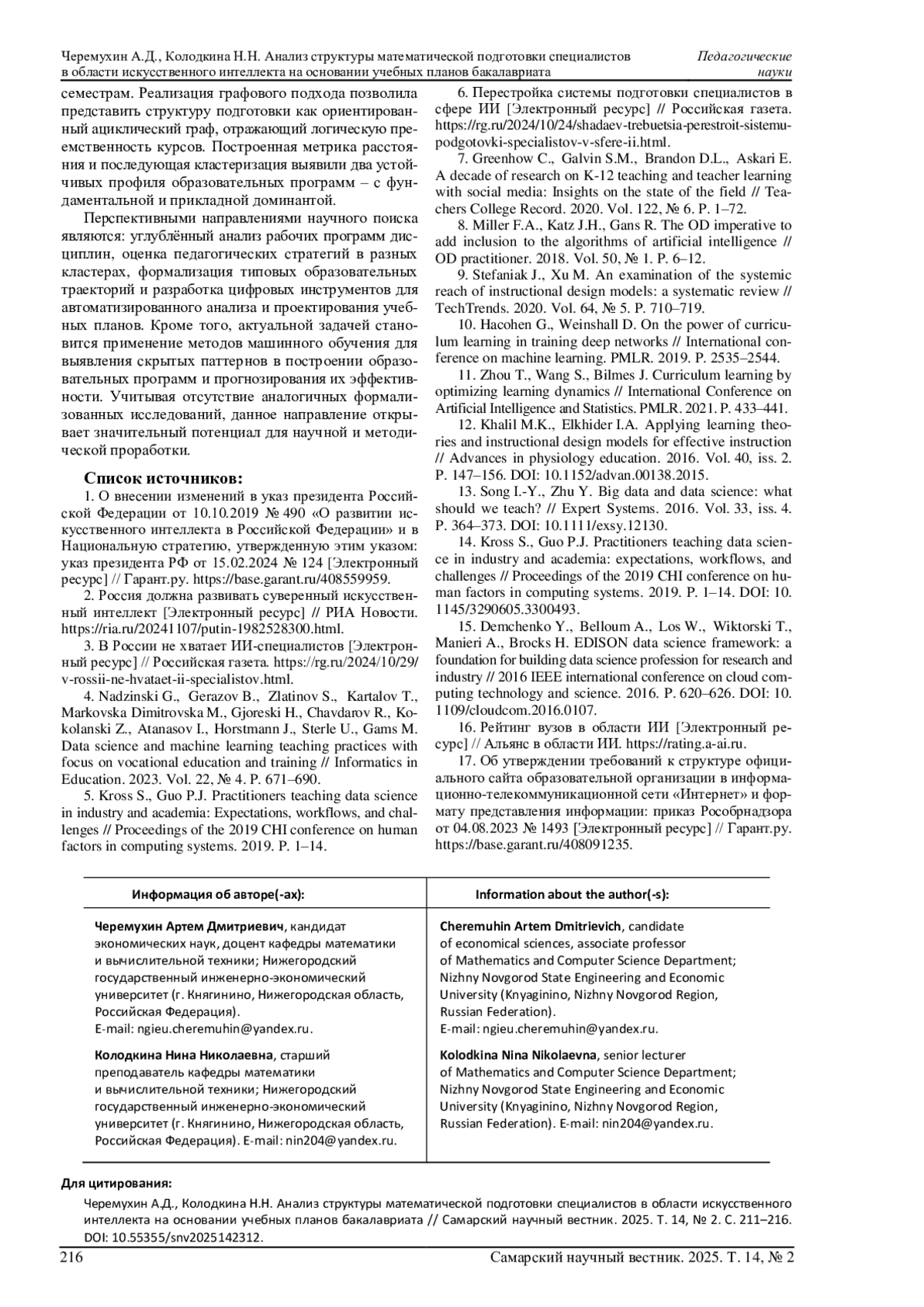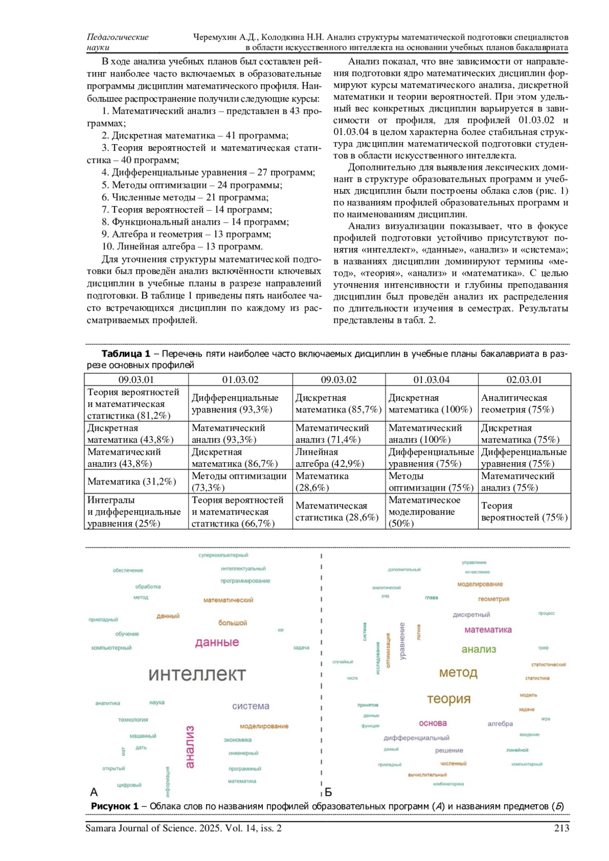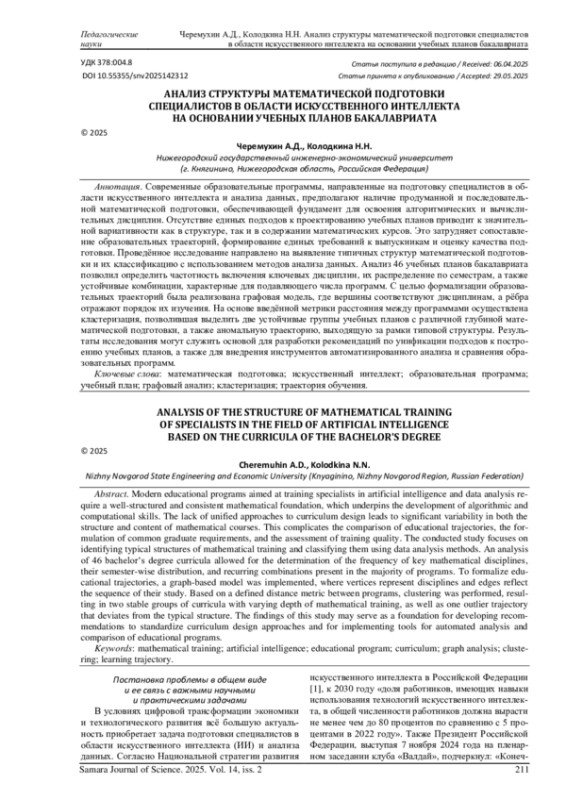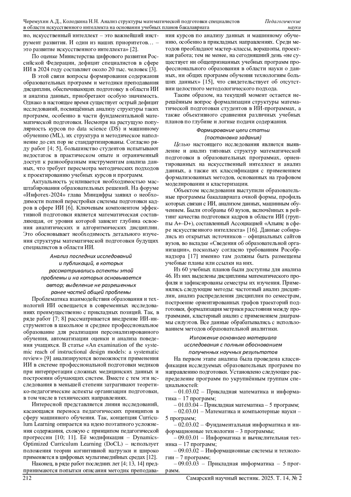 ЧЕРЕМУХИН А. Д., КОЛОДКИНА Н. Н. АНАЛИЗ СТРУКТУРЫ МАТЕМАТИЧЕСКОЙ ПОДГОТОВКИ СПЕЦИАЛИСТОВ В ОБЛАСТИ ИСКУССТВЕННОГО ИНТЕЛЛЕКТА НА ОСНОВАНИИ УЧЕБНЫХ ПЛАНОВ БАКАЛАВРИАТА // САМАРСКИЙ НАУЧНЫЙ ВЕСТНИК. 2025. ТОМ 14, № 2