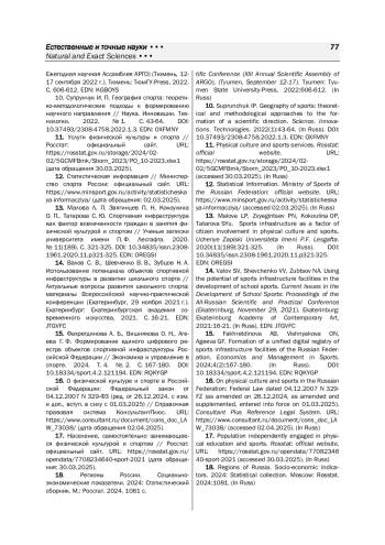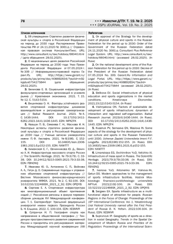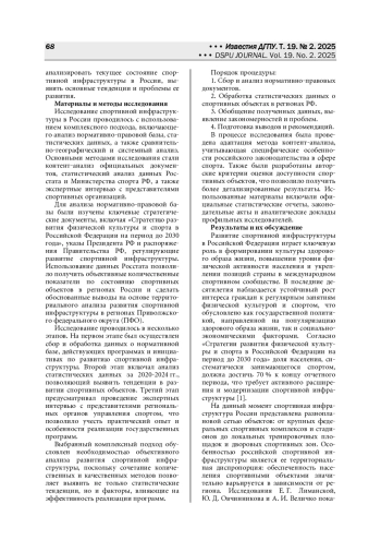 В статье исследуется состояние, особенности развития и география спортивной инфра-структуры в Российской Федерации. Целью работы является анализ текущей ситуации, выявление фак-торов, влияющих на распределение спортивных объектов. В исследовании использованы методы ста-тистического анализа, контент-анализа, аналитический, системный анализ и сравнительно-географический. Результаты показывают, что в России функционирует около 350 000 спортивных со-оружений, но их распределение остается неравномерным. Уровень обеспеченности населения спор-тивной инфраструктурой составляет 64,5 %, однако в ряде регионов он существенно ниже. Основными проблемами остаются нехватка финансирования, недостаточная обеспеченность малых городов и сельских территорий, а также устаревание ряда объектов. В то же время наблюдается рост количества людей, занимающихся спортом, что подтверждает эффективность государственной политики в данной сфере. Выводы подчеркивают необходимость дальнейших инвестиций, разработки адресных программ по развитию спортивных объектов в отдаленных регионах и совершенствования механизмов финанси-рования отрасли.