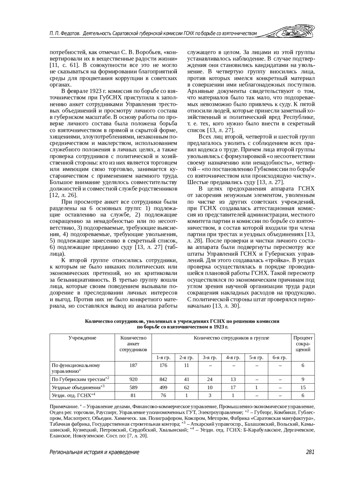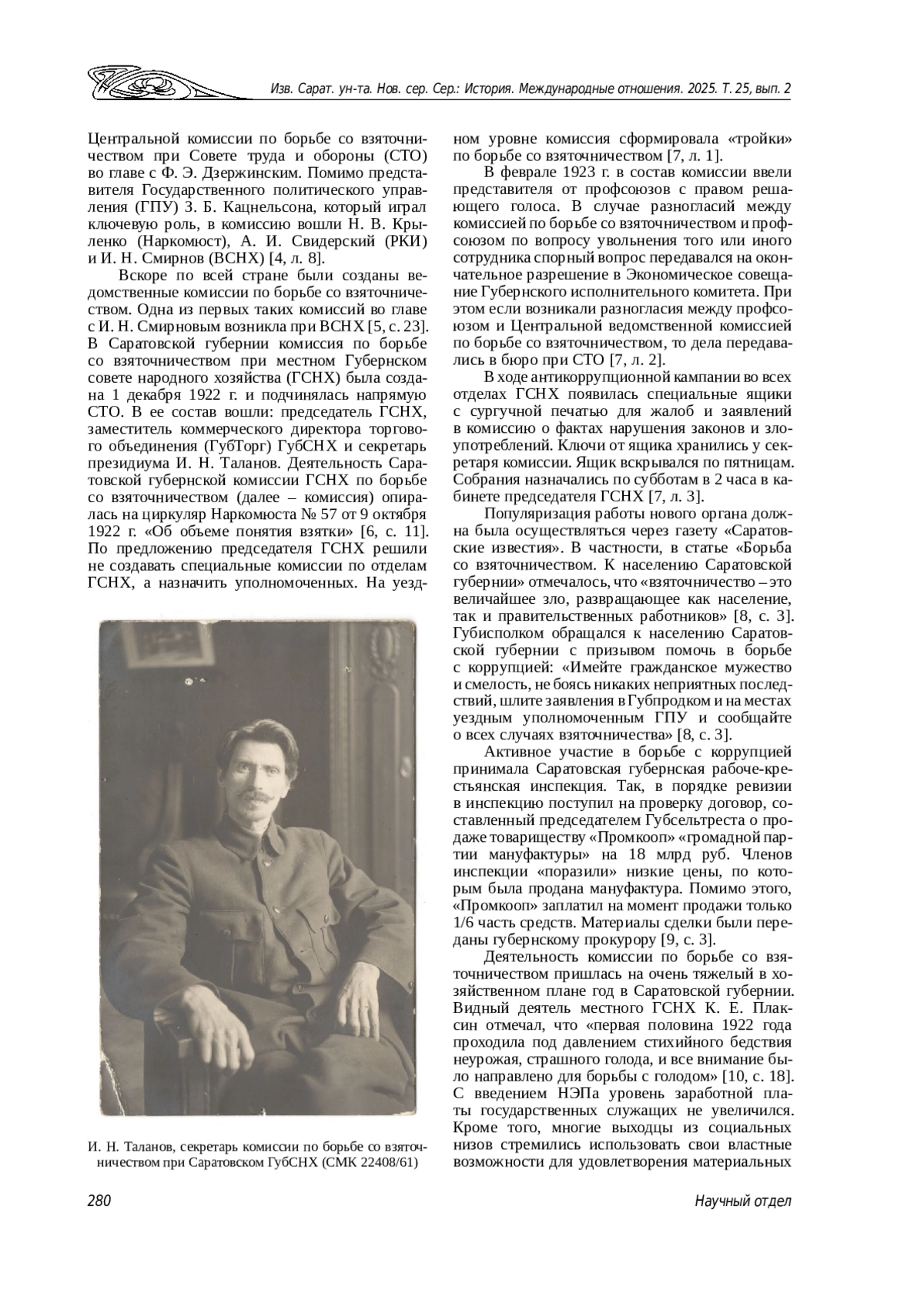 В статье исследована деятельность комиссии по борьбе со взяточничеством при Саратовском губернском совете народного хозяйства. Анализируются методы работы комиссии и стратегии борьбы с коррупцией в советских экономических органах в начале 1920-х гг. Автор изучает результаты деятельности комиссии как одну из первых чисток в советских органах после утверждения НЭПа.