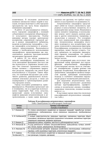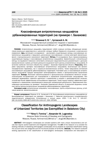 ФОМИНА Н. В., ЛУГОВСКОЙ А. М. КЛАССИФИКАЦИЯ АНТРОПОГЕННЫХ ЛАНДШАФТОВ УРБАНИЗИРОВАННЫХ ТЕРРИТОРИЙ (НА ПРИМЕРЕ Г. БАЛАКОВО) // ИЗВЕСТИЯ ДАГЕСТАНСКОГО ГОСУДАРСТВЕННОГО ПЕДАГОГИЧЕСКОГО УНИВЕРСИТЕТА. ЕСТЕСТВЕННЫЕ И ТОЧНЫЕ НАУКИ. 2025. № 2, ТОМ 19