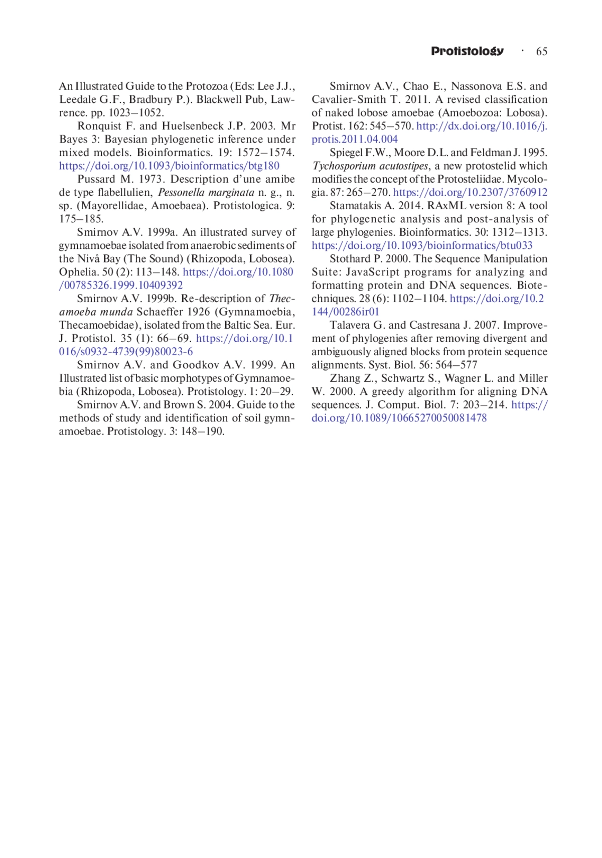 34. Smirnov A.V. 1999a. An illustrated survey of gymnamoebae isolated from anaerobic sediments of the Nivå Bay (The Sound) (Rhizopoda, Lobosea). Ophelia. 50 (2): 113-148. DOI: 10.1080/00785326.1999.10409392