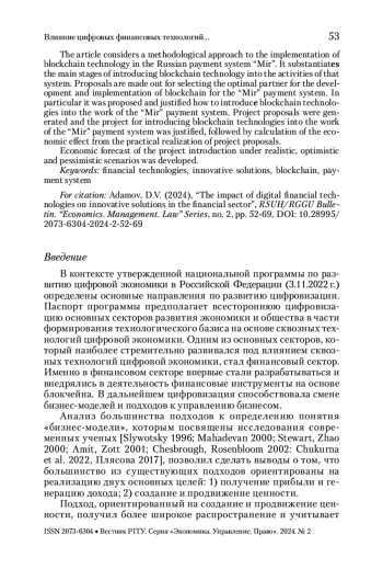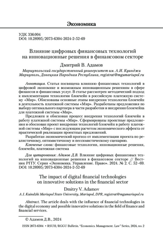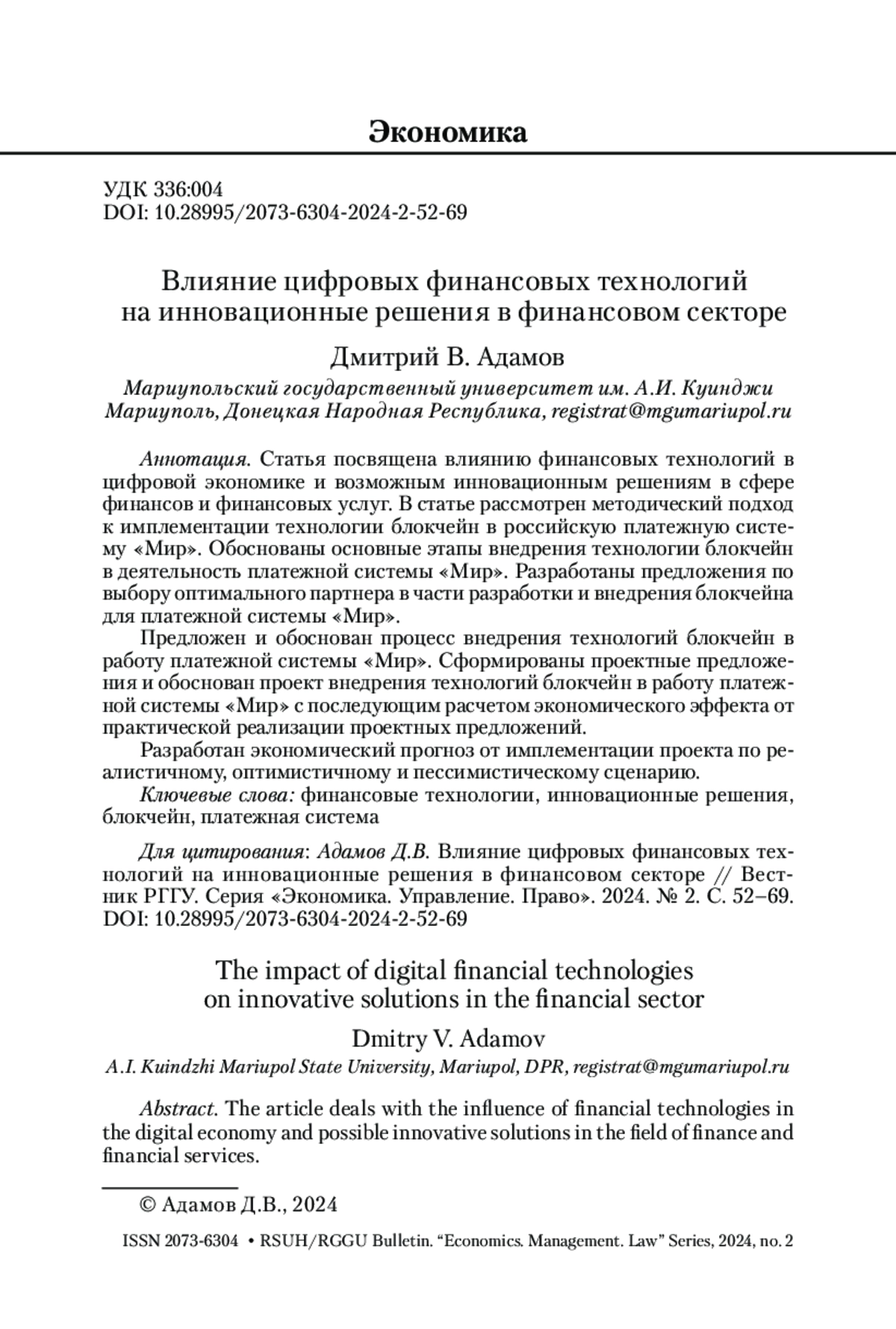 АДАМОВ Д. В. ВЛИЯНИЕ ЦИФРОВЫХ ФИНАНСОВЫХ ТЕХНОЛОГИЙ НА ИННОВАЦИОННЫЕ РЕШЕНИЯ В ФИНАНСОВОМ СЕКТОРЕ // ВЕСТНИК РГГУ. СЕРИЯ: ЭКОНОМИКА. УПРАВЛЕНИЕ. ПРАВО. 2024. № 2