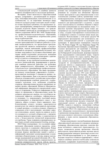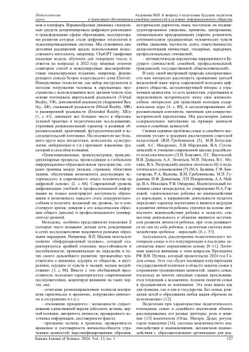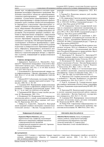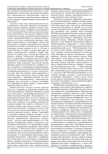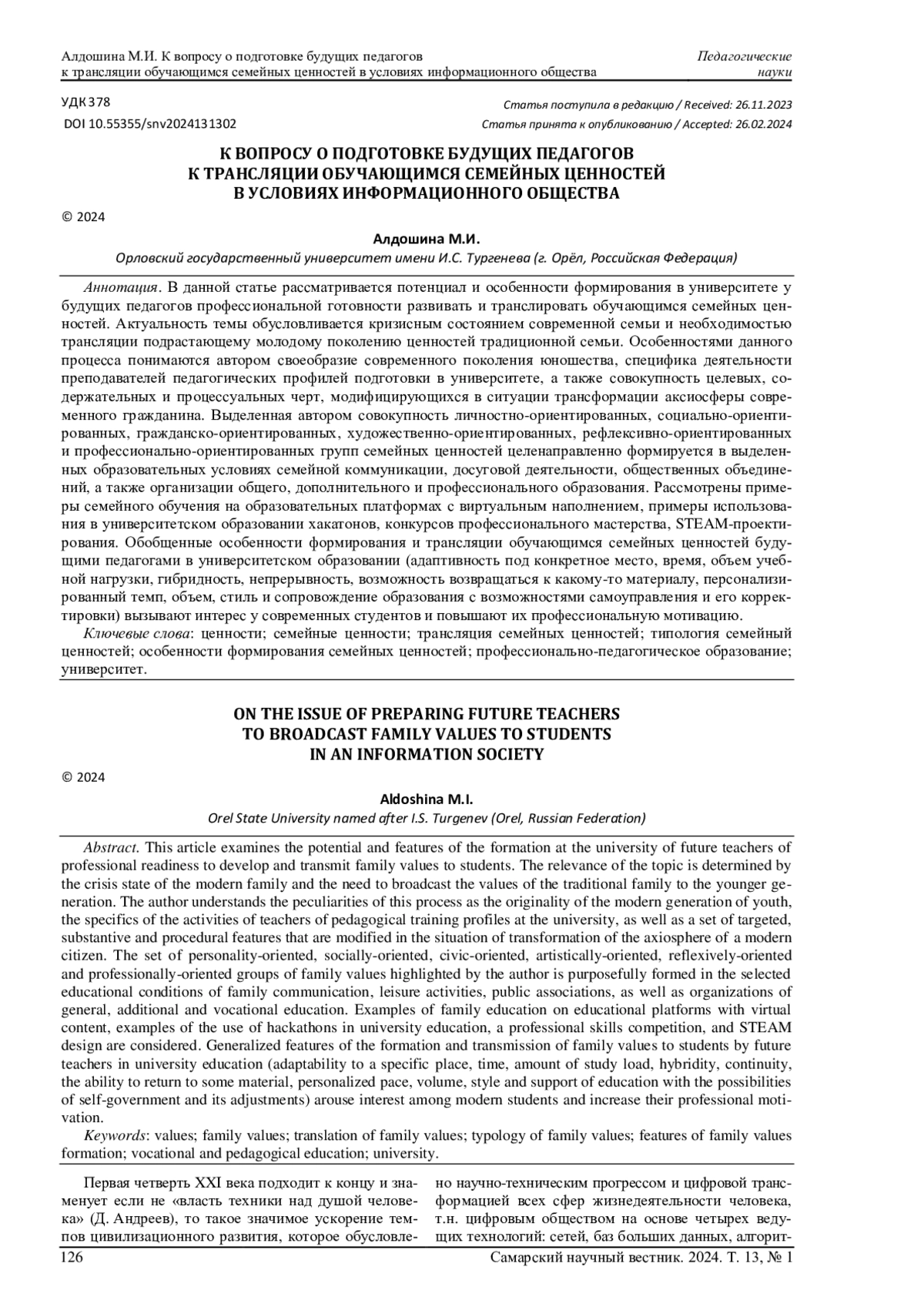 АЛДОШИНА М. И. К ВОПРОСУ О ПОДГОТОВКЕ БУДУЩИХ ПЕДАГОГОВ К ТРАНСЛЯЦИИ ОБУЧАЮЩИМСЯ СЕМЕЙНЫХ ЦЕННОСТЕЙ В УСЛОВИЯХ ИНФОРМАЦИОННОГО ОБЩЕСТВА // САМАРСКИЙ НАУЧНЫЙ ВЕСТНИК. 2024. ТОМ 13, № 1