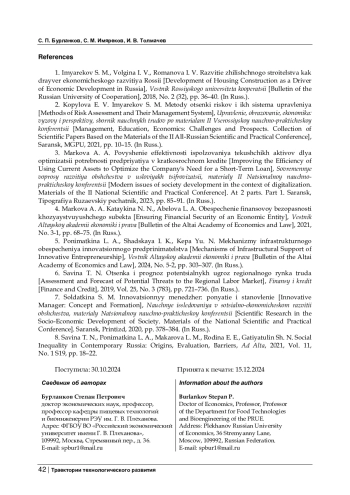 1. Имяреков С. М., Волгина И. В., Романова И. В. Развитие жилищного строительства как драйвер экономического развития России // Вестник Российского университета кооперации. - 2018. - № 2 (32). - С. 36-40. EDN: XSKACD