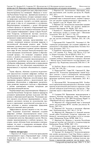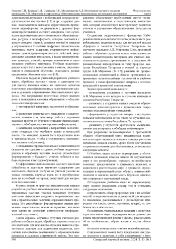 В данной работе авторы раскрывают практическую значимость научных трудов почетного профессора Набережночелнинского государственного педагогического университета Анатолия Владимировича Миронова в контексте современного образования, демонстрируя инновационный подход к адаптации его теоретических концепций для создания цифровых образовательных ресурсов. Основная цель проекта - интегрировать исследования природных ресурсов и экологии Республики Татарстан в серию видеоматериалов для учеников начальной школы. Студенты, участвовавшие в проекте, не только осваивали технологии создания видео, но и углубляли свои познания в области педагогики, теории и технологии преподавания интегрированного курса «Окружающий мир», экологического образования младших школьников. Под руководством преподавателей будущие учителя изучали научные труды А. В. Миронова, адаптировали его методические рекомендации к созданию интерактивных и доступных для обучающихся начальной школы видеоконтентов. Проект успешно объединил теорию и практику, позволив будущим педагогам не только формировать профессиональные компетенции, но и развивать творческий потенциал. Использование видеоматериалов, основанных на научном наследии А. В. Миронова, способствует активизации учебного процесса, делая его более вовлекающим и интересным для младших школьников. Созданные видеоролики, отражающие экологию и природное богатство Татарстана, представляют собой ценный дополнительный материал к урокам изучения окружающего мира.