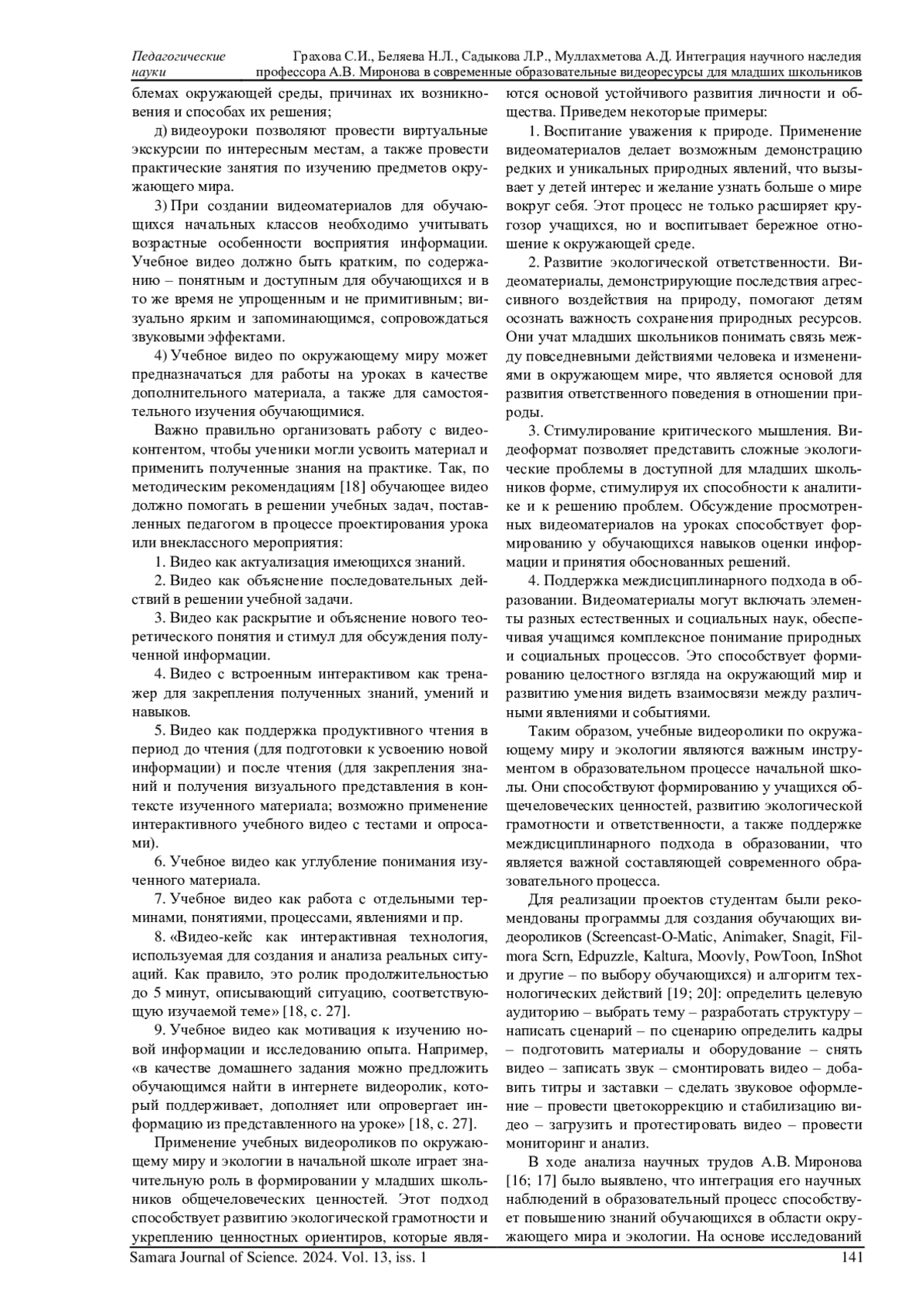 20. Грахова С.И., Сунаева Т.И. Создание видеороликов как творческая интерпретация художественного произведения в начальных классах // Высокие технологии и инновации в науке: сборник избранных статей междунар. науч. конф. (Санкт-Петербург, май 2022 г.). СПб.: ГНИИ “Нацразвитие”, 2022. С. 63-65.