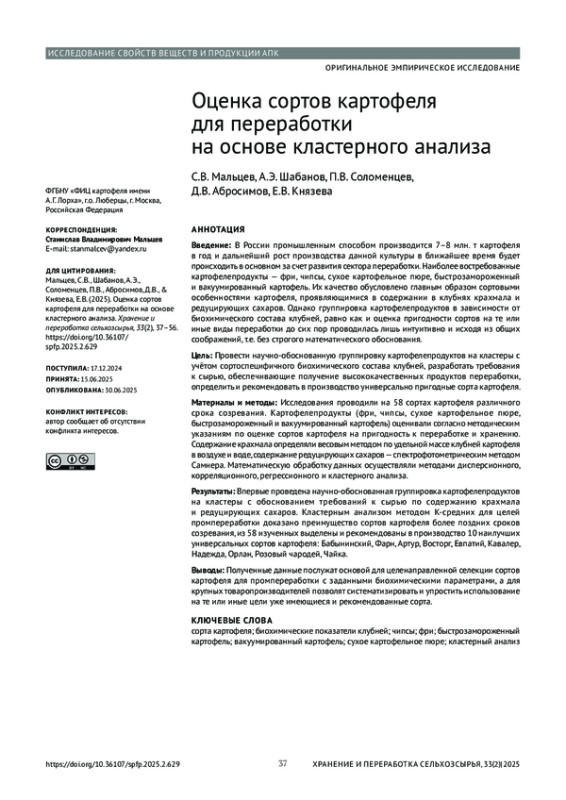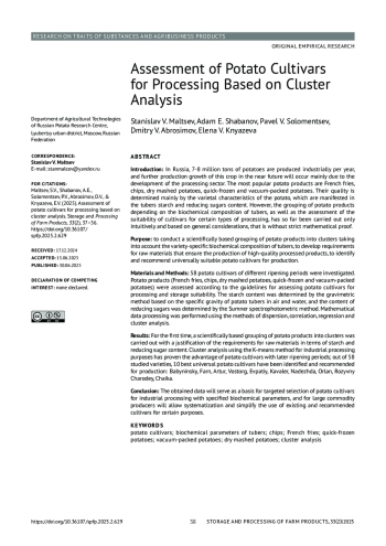 Результаты: Впервые проведена научно-обоснованная группировка картофелепродуктов на кластеры с обоснованием требований к сырью по содержанию крахмала и редуцирующих сахаров. Кластерным анализом методом К-средних для целей промпереработки доказано преимущество сортов картофеля более поздних сроков созревания, из 58 изученных выделены и рекомендованы в производство 10 наилучших универсальных сортов картофеля: Бабынинский, Фарн, Артур, Восторг, Евпатий, Кавалер, Надежда, Орлан, Розовый чародей, Чайка.