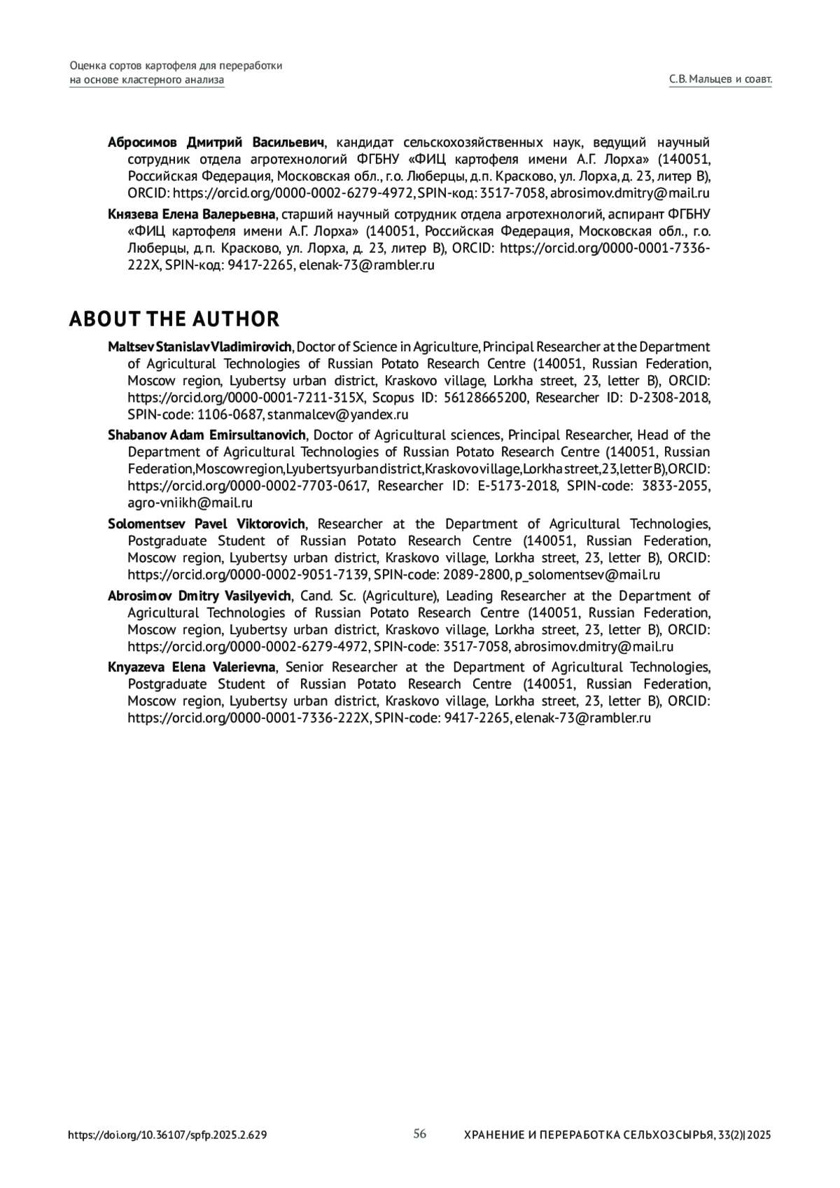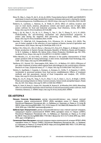 1. Зейрук, В.Н., Мальцев, С.В., Васильева, С.В., & Бызов, В.А. (2019). Современные производственные факторы, определяющие биологическую и экономическую эффективность хранения картофеля. Хранение и переработка сельхозсырья, 3, 20-28. DOI: 10.36107/spfp.2019.177