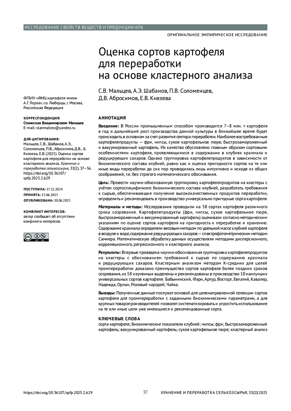 Картофель (Solanum tuberosum L.) является одной из важнейших продовольственных культур в мире, а в России его значимость усиливается за счёт развитого сектора промышленной переработки (Li et al., 2024).