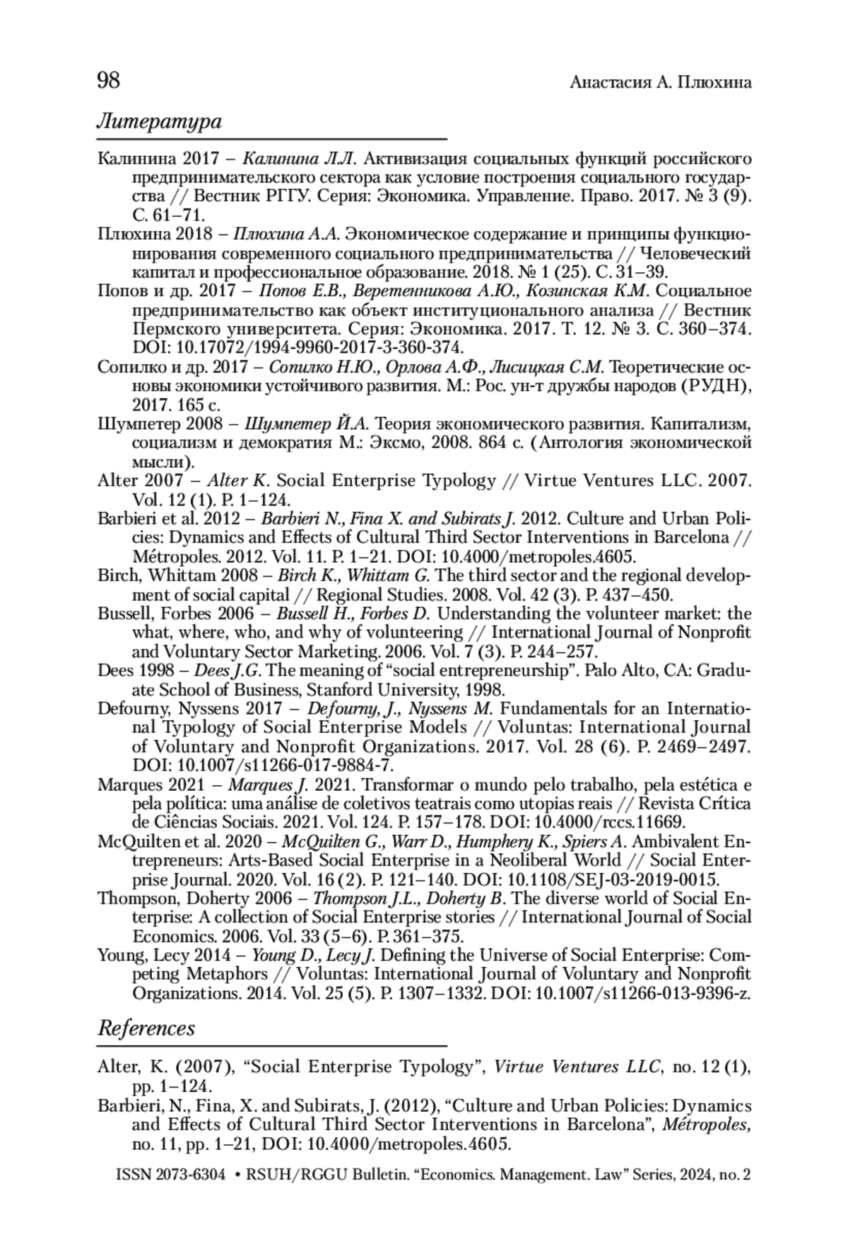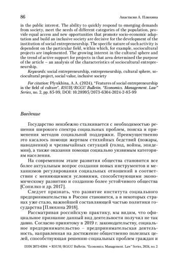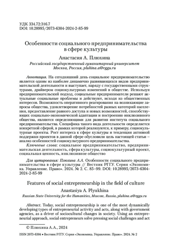 ПЛЮХИНА А. А. ОСОБЕННОСТИ СОЦИАЛЬНОГО ПРЕДПРИНИМАТЕЛЬСТВА В СФЕРЕ КУЛЬТУРЫ // ВЕСТНИК РГГУ. СЕРИЯ: ЭКОНОМИКА. УПРАВЛЕНИЕ. ПРАВО. 2024. № 2