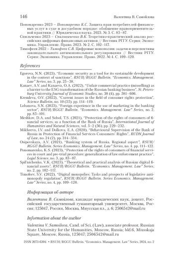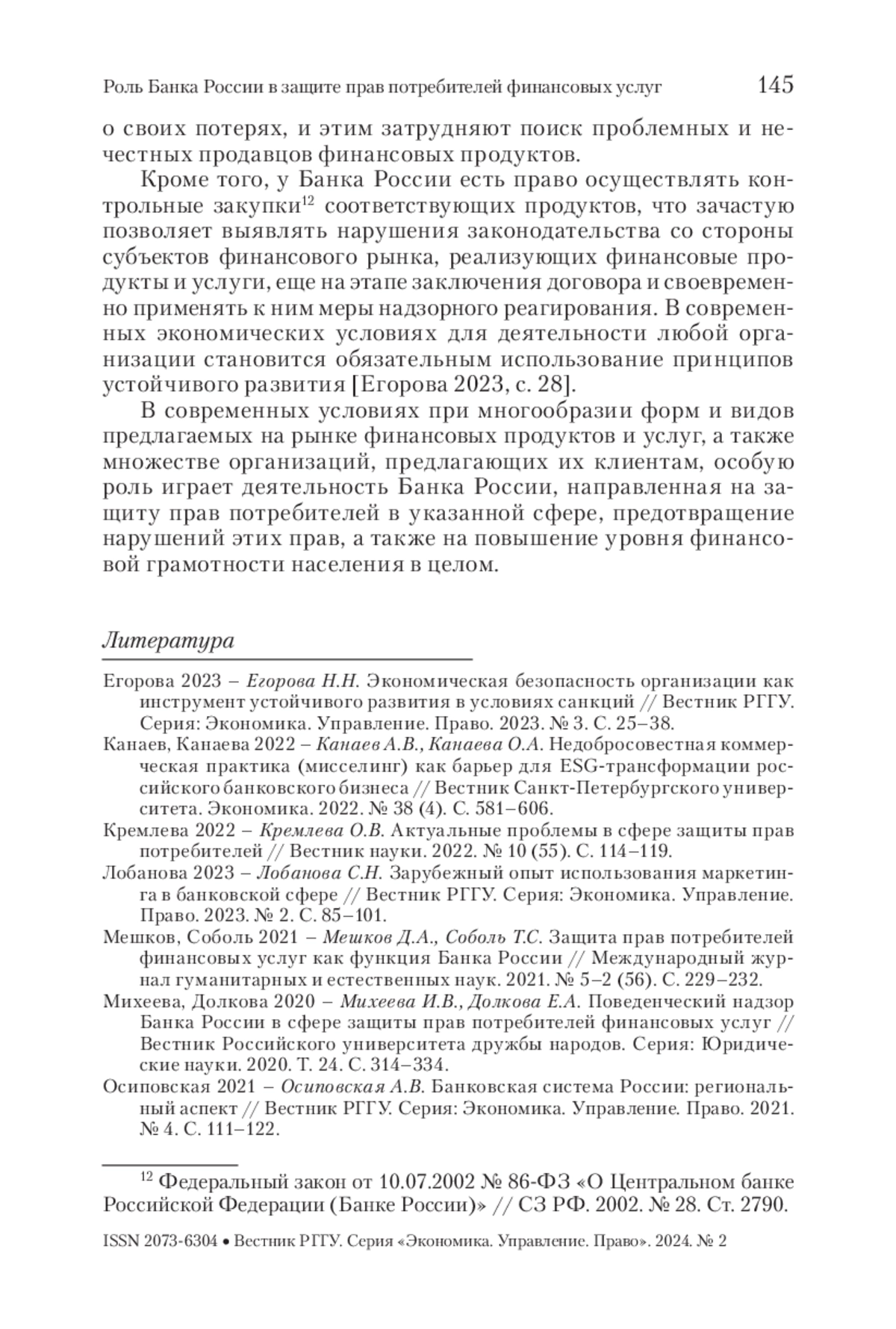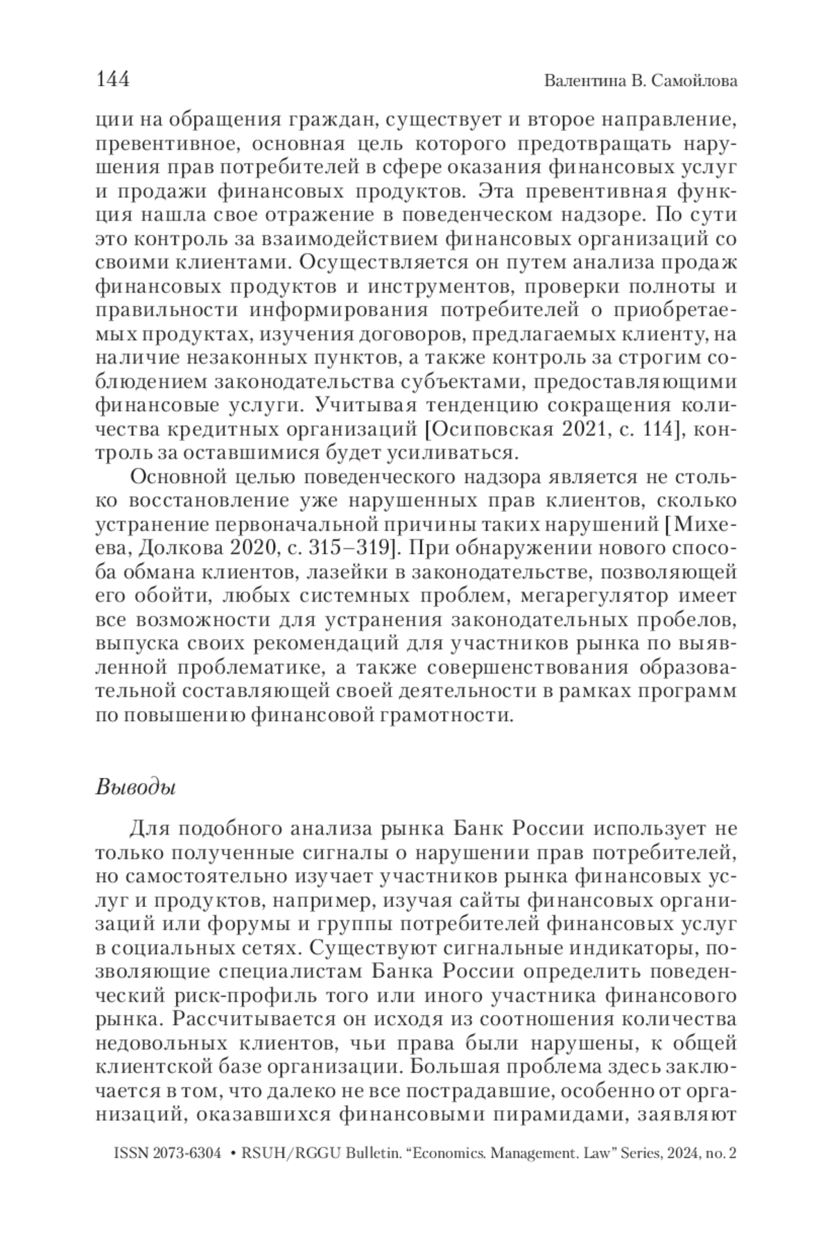 САМОЙЛОВА В. В. РОЛЬ БАНКА РОССИИ В ЗАЩИТЕ ПРАВ ПОТРЕБИТЕЛЕЙ ФИНАНСОВЫХ УСЛУГ // ВЕСТНИК РГГУ. СЕРИЯ: ЭКОНОМИКА. УПРАВЛЕНИЕ. ПРАВО. 2024. № 2