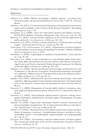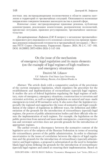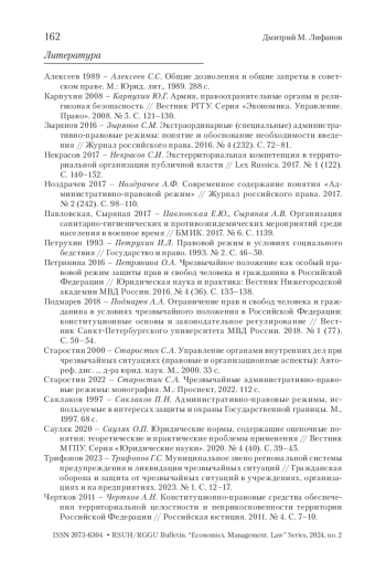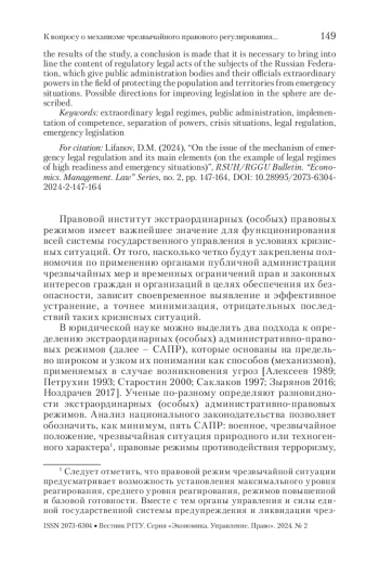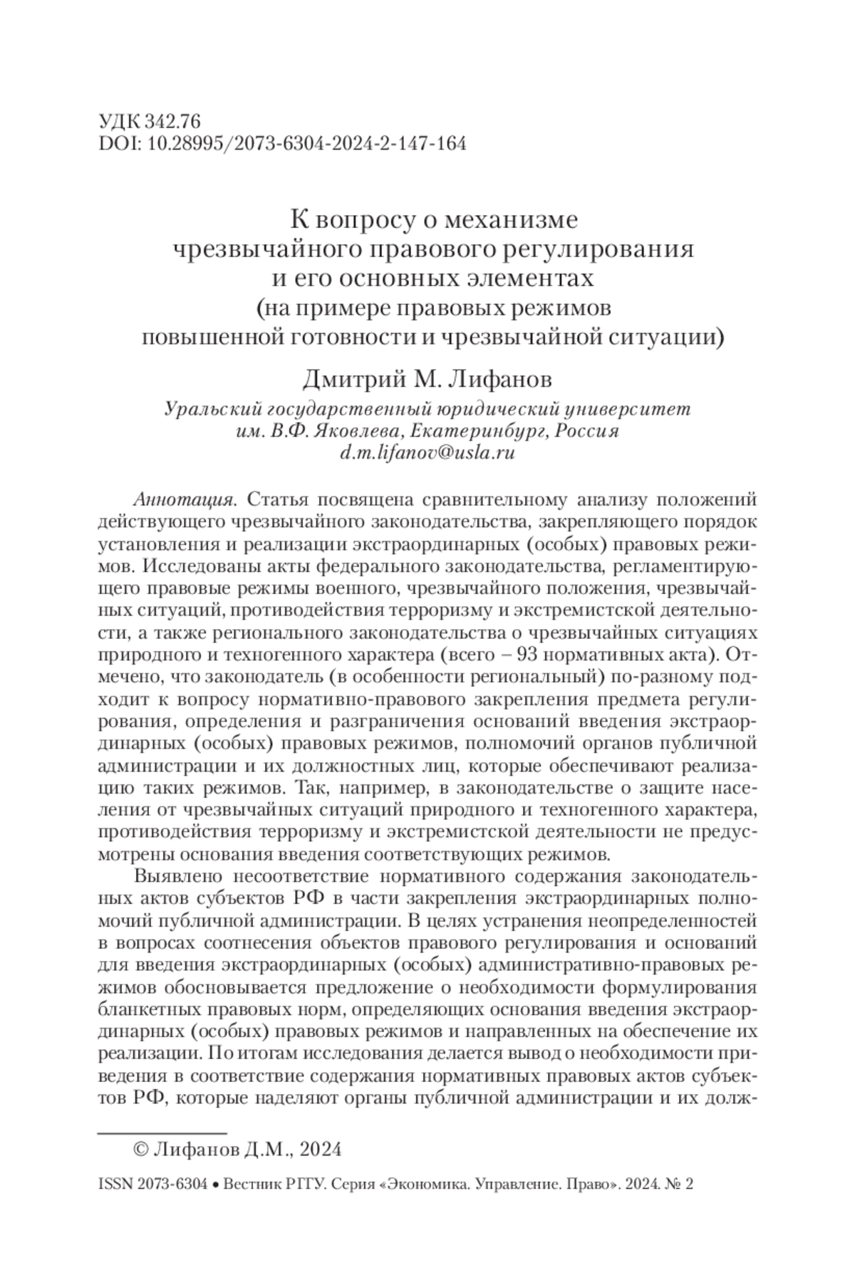ЛИФАНОВ Д. М. К ВОПРОСУ О МЕХАНИЗМЕ ЧРЕЗВЫЧАЙНОГО ПРАВОВОГО РЕГУЛИРОВАНИЯ И ЕГО ОСНОВНЫХ ЭЛЕМЕНТАХ (НА ПРИМЕРЕ ПРАВОВЫХ РЕЖИМОВ ПОВЫШЕННОЙ ГОТОВНОСТИ И ЧРЕЗВЫЧАЙНОЙ СИТУАЦИИ) // ВЕСТНИК РГГУ. СЕРИЯ: ЭКОНОМИКА. УПРАВЛЕНИЕ. ПРАВО. 2024. № 2