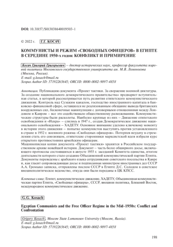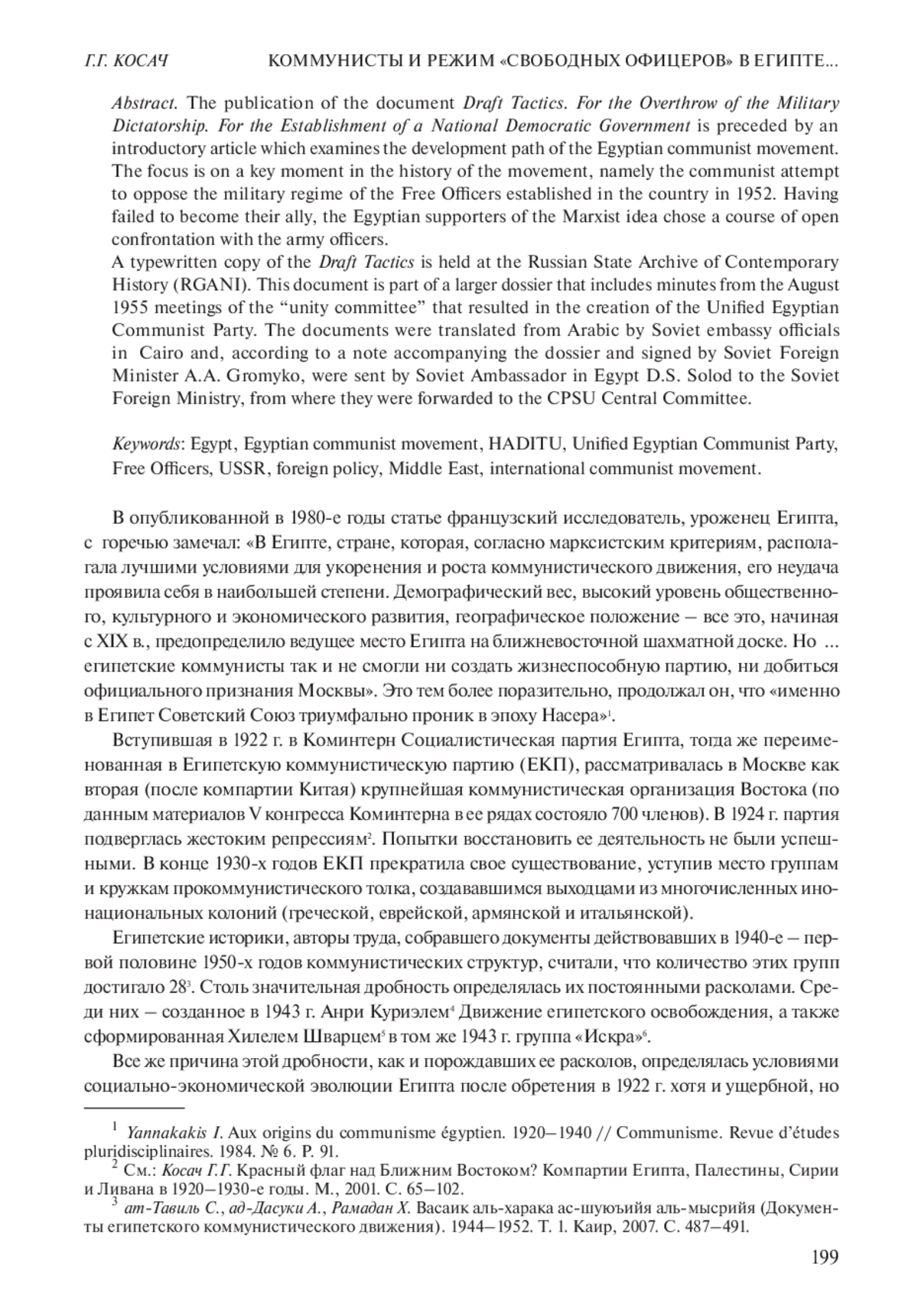 6. Kosach G.G. Krasnyi flag nad Blijnim Vostokom? Kompartii Egipta, Palestiny, Sirii i Livana v 1920-1930-e gody [Red flag over the Middle East? The Communist Parties of Egypt, Palestine, Syria and Lebanon in the 1920-1930s]. Moskva, 2001. (In Russ.).