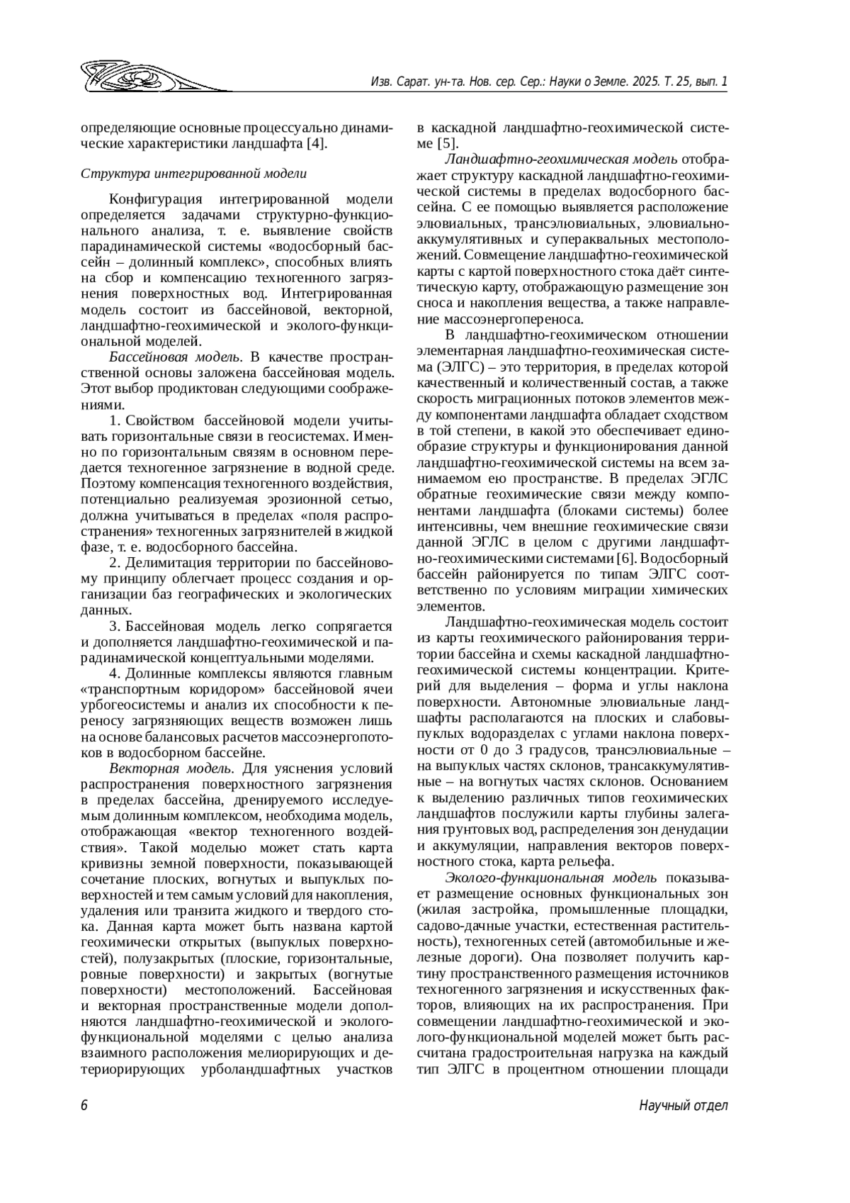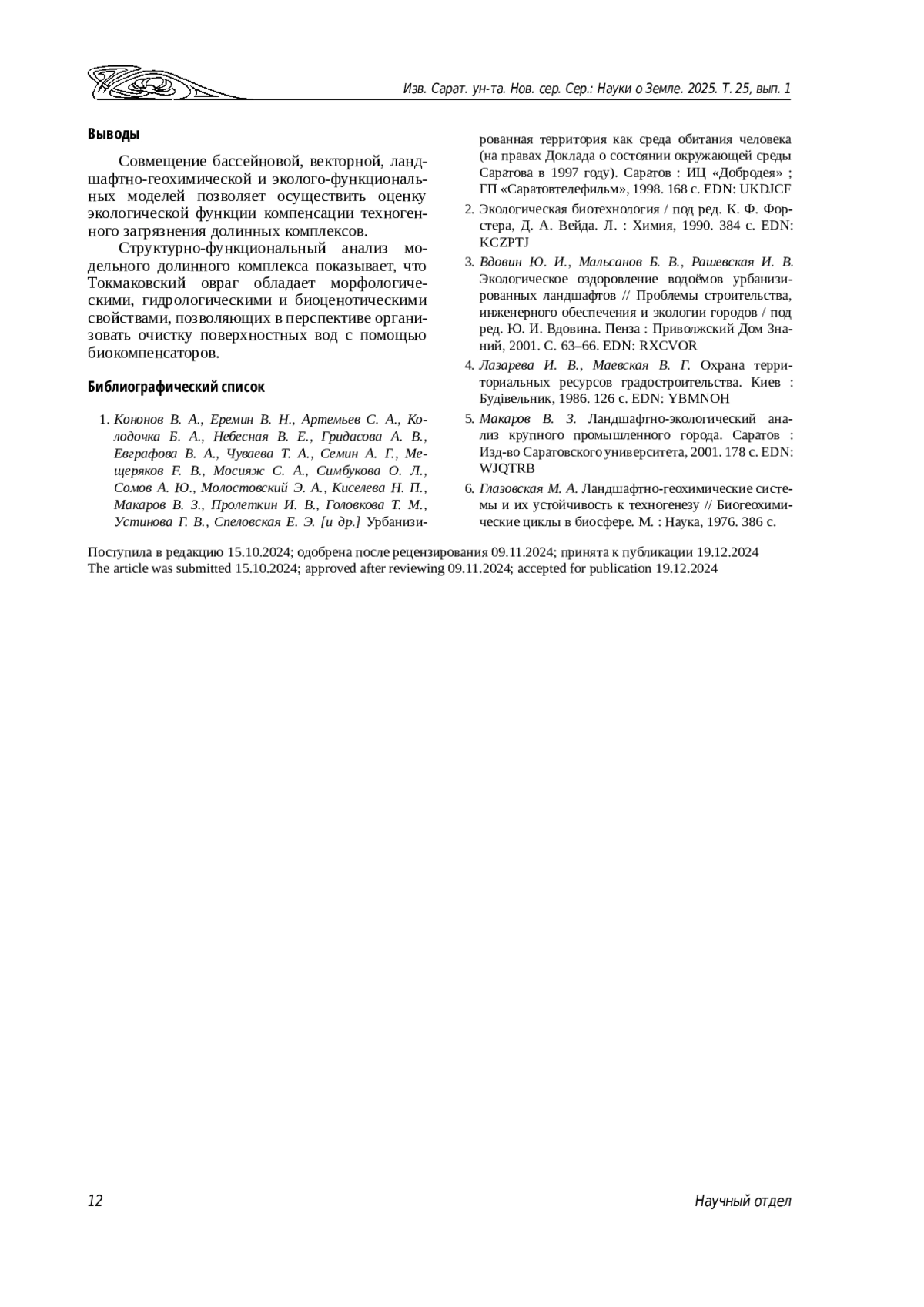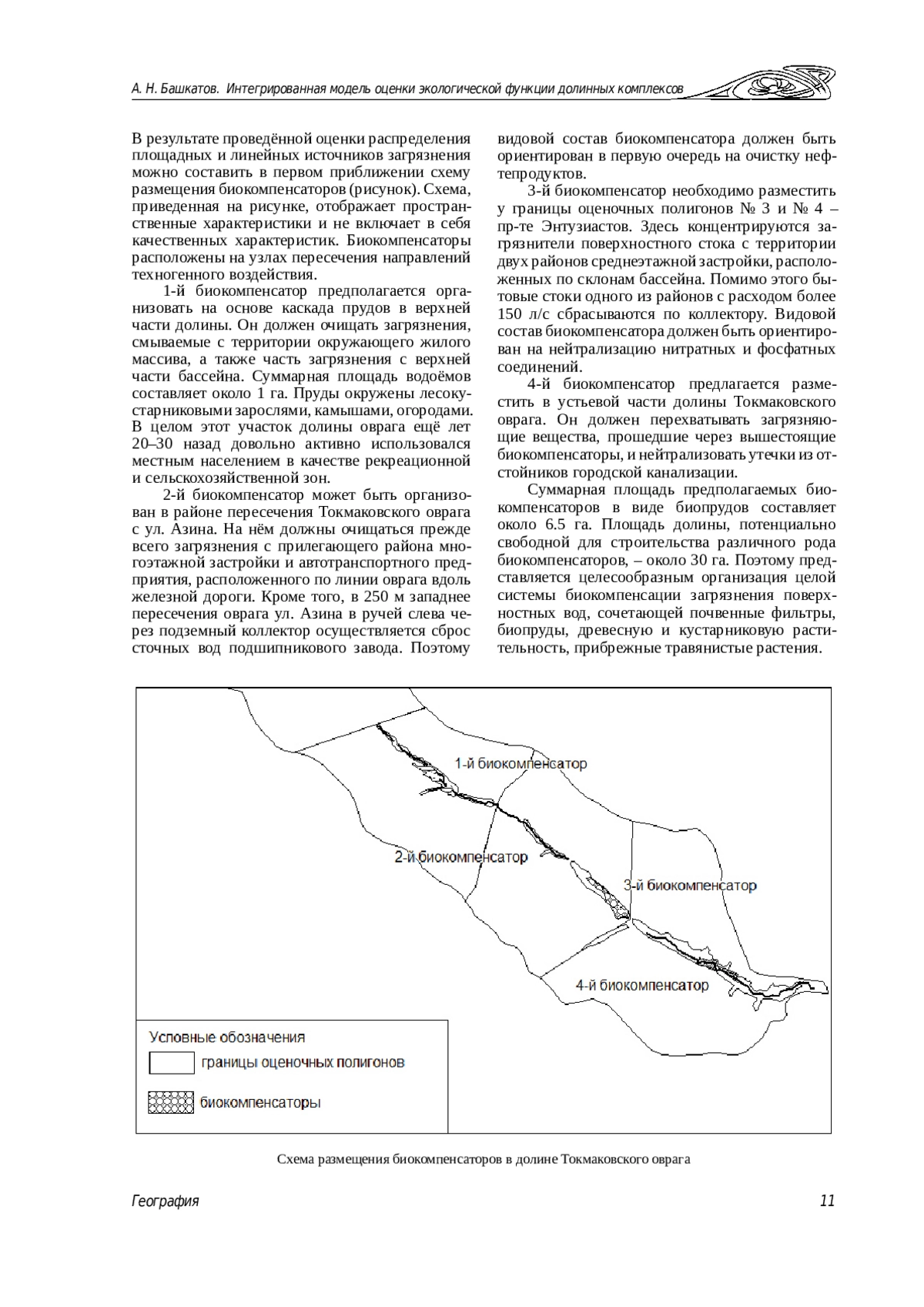 Рассматриваются методологические аспекты оценки городской территории на основе интеграции бассейновой, векторной, ландшафтно-геохимической и эколого-функциональной моделей. В качестве объекта исследования был выбран Токмаковский овраг, расположенный на южной окраине г. Саратова. Долина оврага представляет собой типичный элемент ландшафтной структуры Приволжской возвышенности и сохранила традиционные формы природопользования. Проведённый структурно-функциональный анализ модельного долинного комплекса показывает возможность использования свойств эрозионной сети для сбора и очистки поверхностного стока. Разработана пространственная схема размещения биологических компенсаторов на основе существующего каскада прудов. Также предложено градопланировочное решение по организации рекреационных зон в верховьях водосборного бассейна, районах многоэтажной застройки и в месте впадения русла Токмаковского ручья в Волгоградское водохранилище.