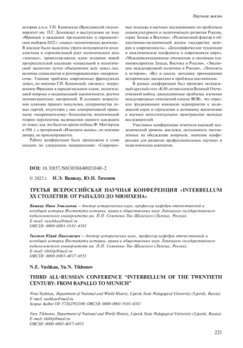 22 апреля 2022 г. Центр германских исторических исследований Института истории, права и общественных наук Липецкого государственного педагогического университета им. П. П. Семенова-Тян-Шанского (ИИПиОН ЛГПУ) провел Третью всероссийскую научную конференцию «Interbellum ХХ столетия: от Рапалло до Мюнхена», посвященную 100-летнему юбилею советско-германского Рапалльского договора 1922 г. Было представлено более 30 докладов и сообщений, затрагивающих различные проблемы международных отношений в межвоенный период. Модератором первой части конференции был профессор кафедры отечественной и всеобщей истории ЛГПУ д. и. н. Ю. Н. Тихонов