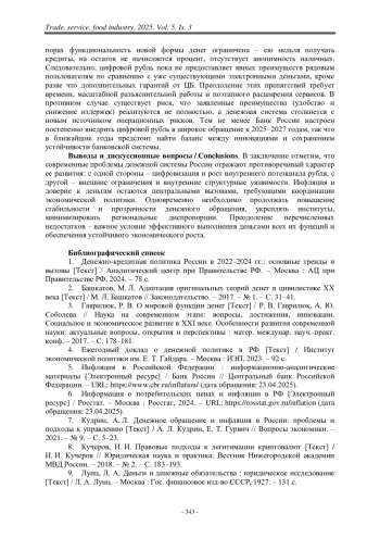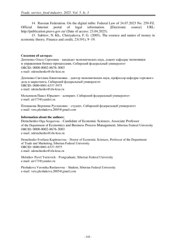 ДЕМЧЕНКО О. С., ДЕМЧЕНКО С. К., МЕЛЬНИКОВ П. Ю., ПЛЕШАКОВА В. Р. МОДИФИКАЦИЯ СОВРЕМЕННЫХ ДЕНЕГ И ИХ ФУНКЦИЙ // ТОРГОВЛЯ, СЕРВИС, ИНДУСТРИЯ ПИТАНИЯ. 2025. № 3, ТОМ 5