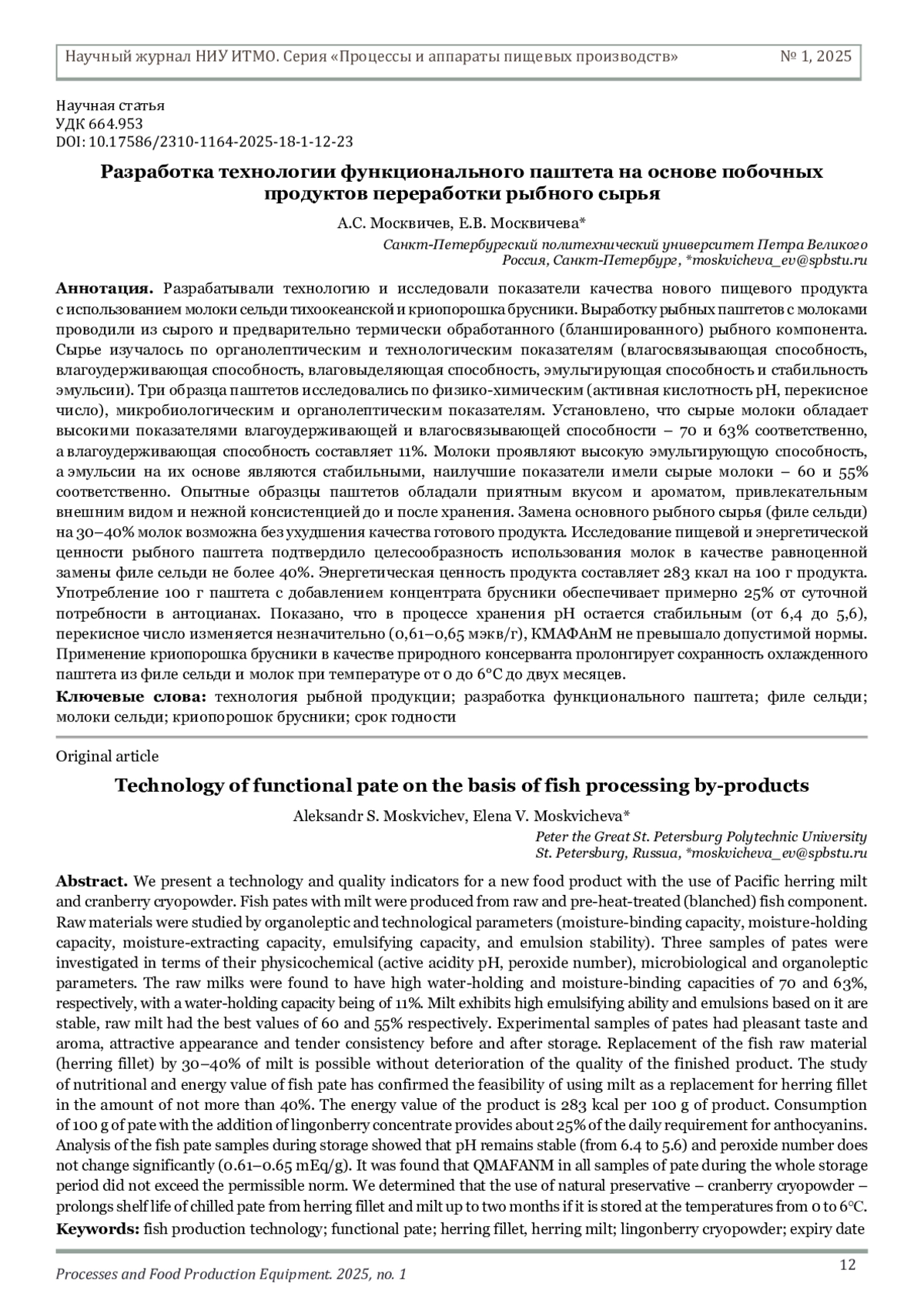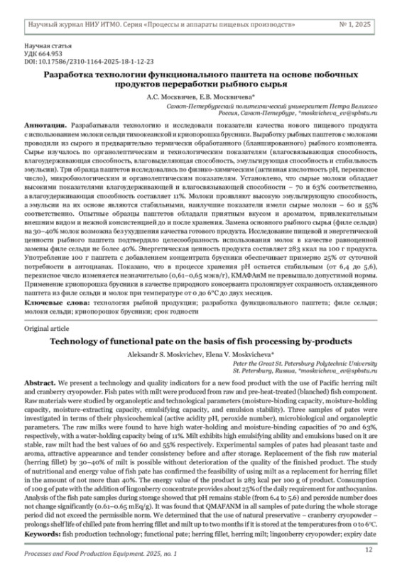 МОСКВИЧЕВ А. С., МОСКВИЧЕВА Е. В. РАЗРАБОТКА ТЕХНОЛОГИИ ФУНКЦИОНАЛЬНОГО ПАШТЕТА НА ОСНОВЕ ПОБОЧНЫХ ПРОДУКТОВ ПЕРЕРАБОТКИ РЫБНОГО СЫРЬЯ // НАУЧНЫЙ ЖУРНАЛ НИУ ИТМО. СЕРИЯ: ПРОЦЕССЫ И АППАРАТЫ ПИЩЕВЫХ ПРОИЗВОДСТВ. 2025. № 1 (63)