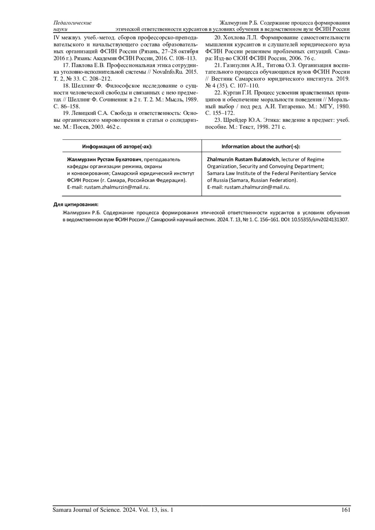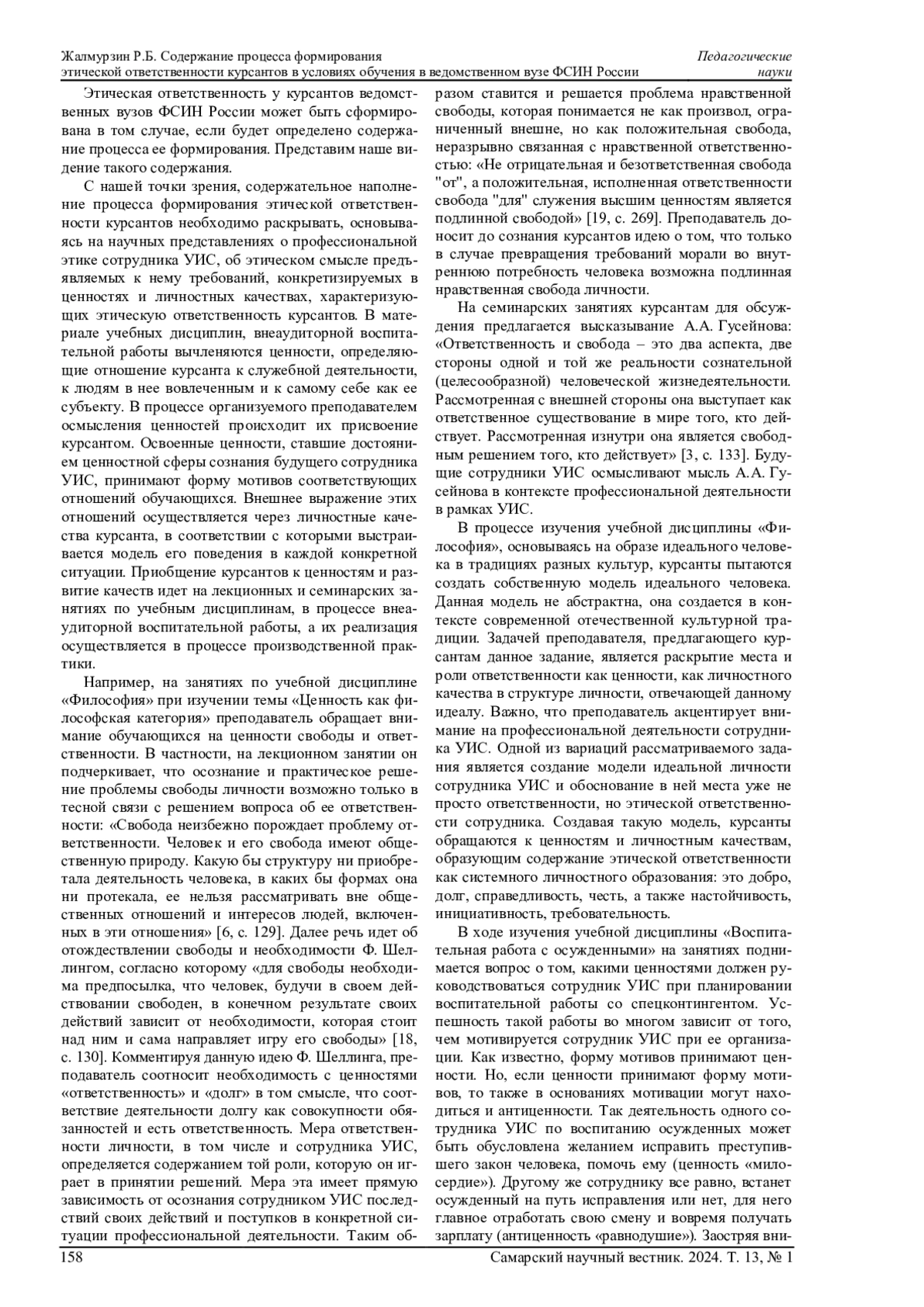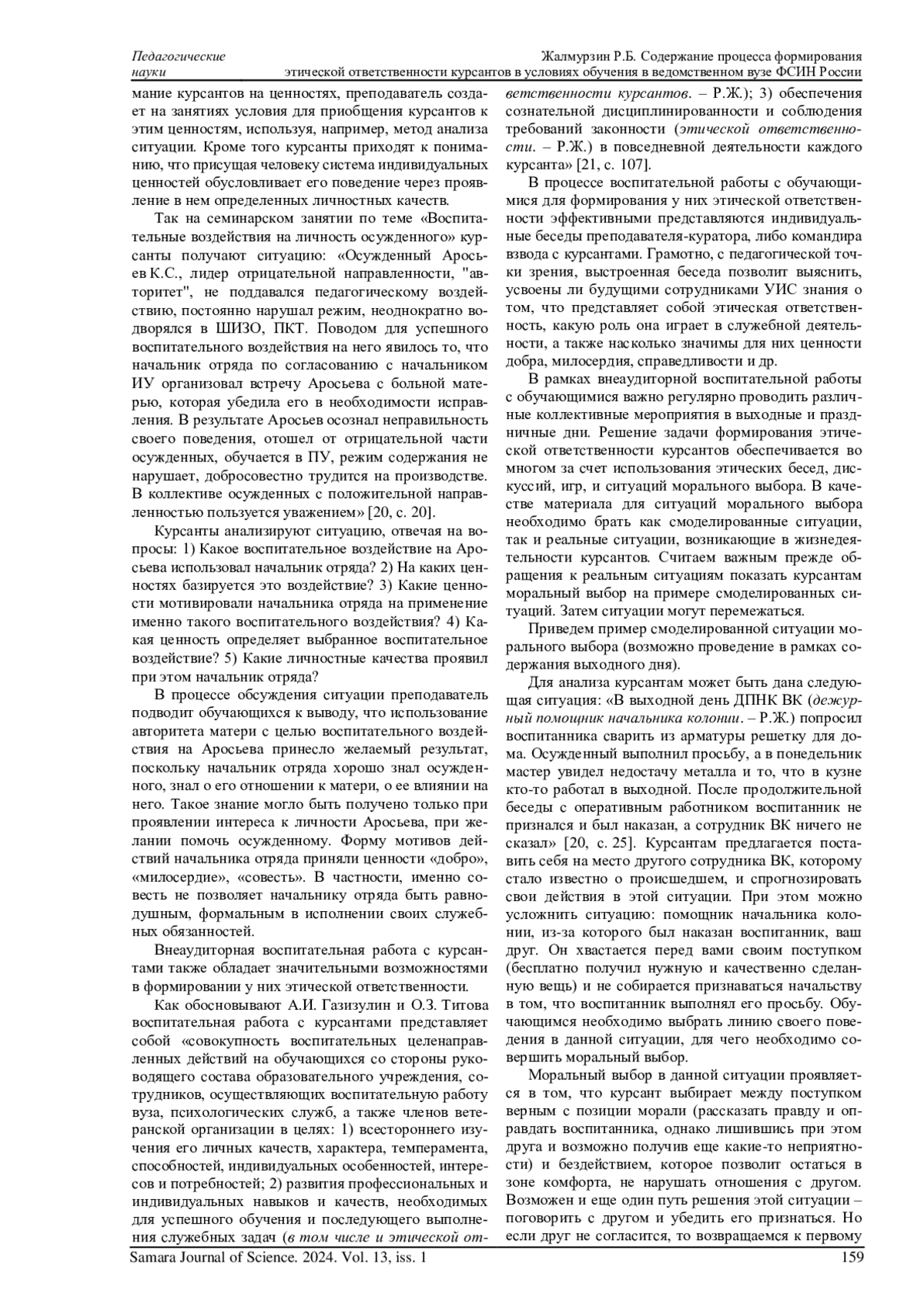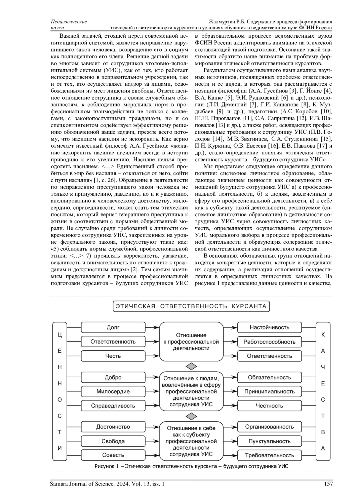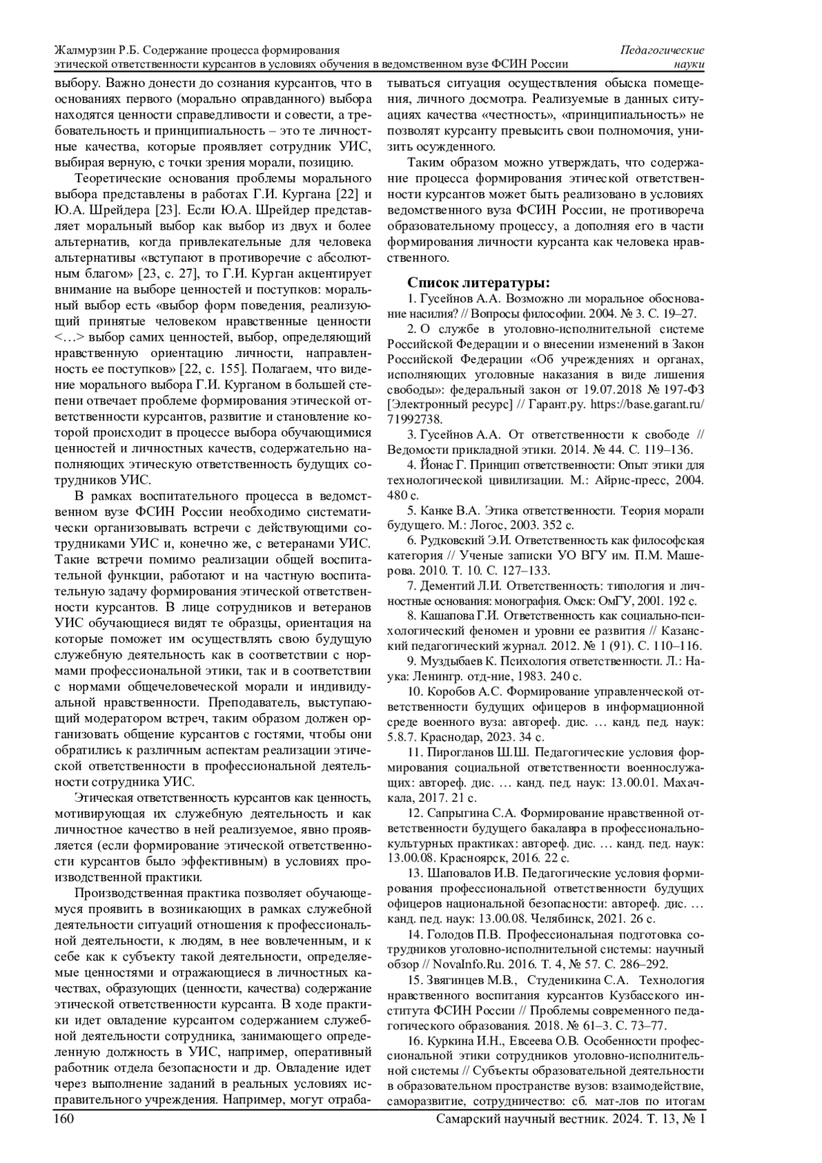 ЖАЛМУРЗИН Р. Б. СОДЕРЖАНИЕ ПРОЦЕССА ФОРМИРОВАНИЯ ЭТИЧЕСКОЙ ОТВЕТСТВЕННОСТИ КУРСАНТОВ В УСЛОВИЯХ ОБУЧЕНИЯ В ВЕДОМСТВЕННОМ ВУЗЕ ФСИН РОССИИ // САМАРСКИЙ НАУЧНЫЙ ВЕСТНИК. 2024. ТОМ 13, № 1