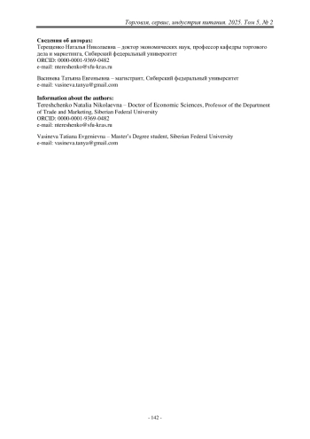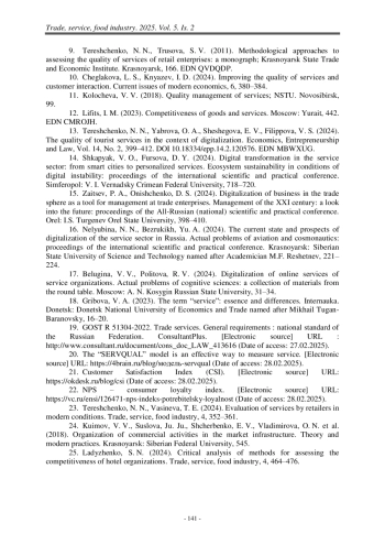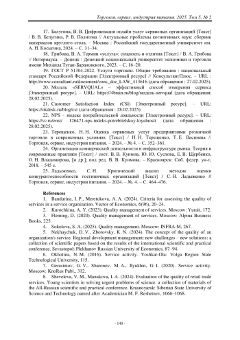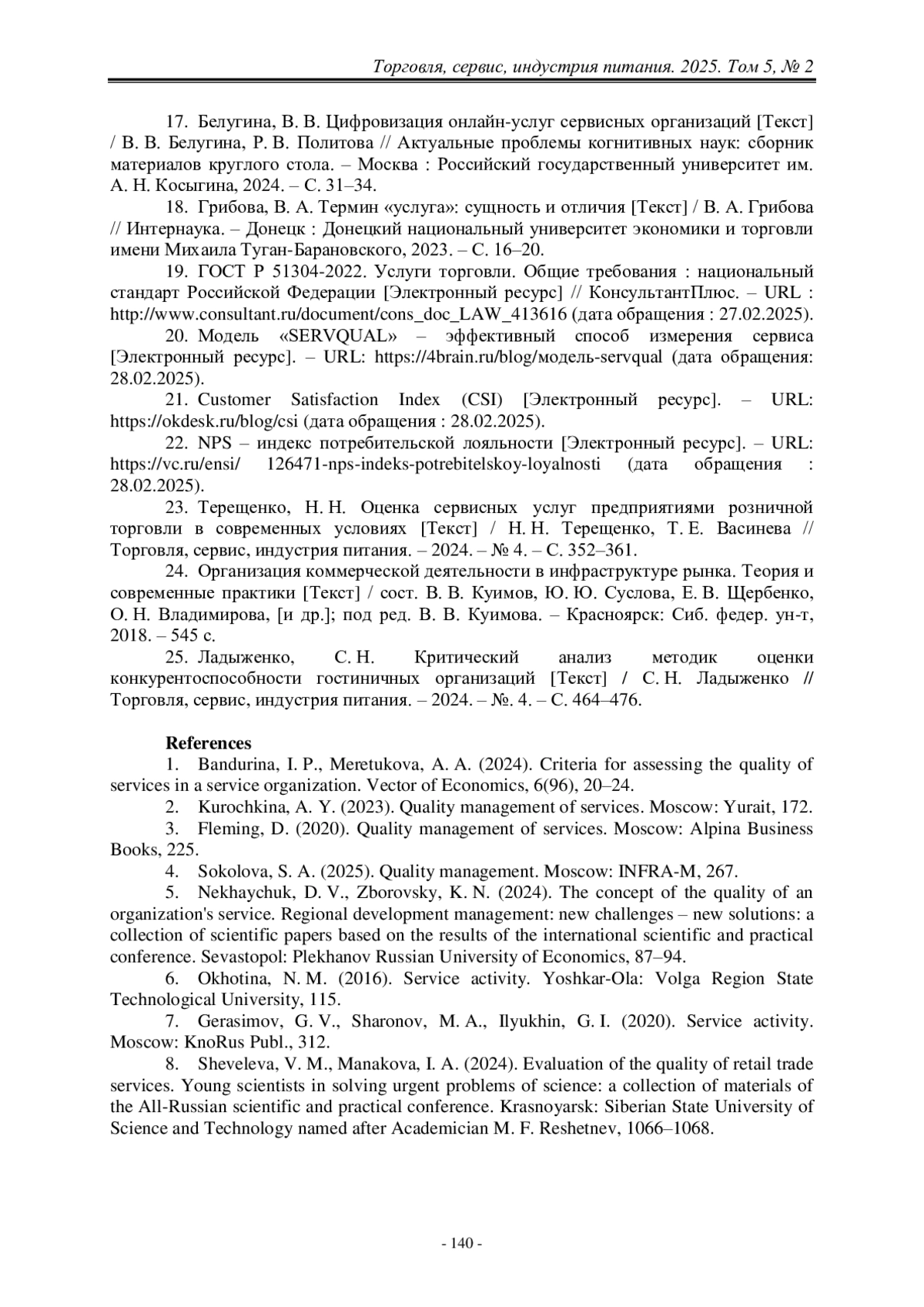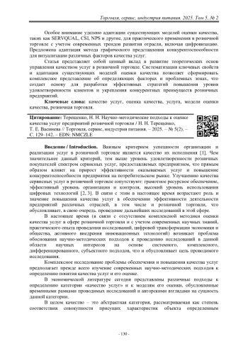ТЕРЕЩЕНКО Н. Н., ВАСИНЕВА Т. Е. НАУЧНО-МЕТОДИЧЕСКИЕ ПОДХОДЫ К ОЦЕНКЕ КАЧЕСТВА УСЛУГ ПРЕДПРИЯТИЙ РОЗНИЧНОЙ ТОРГОВЛИ // ТОРГОВЛЯ, СЕРВИС, ИНДУСТРИЯ ПИТАНИЯ. 2025. № 2, ТОМ 5