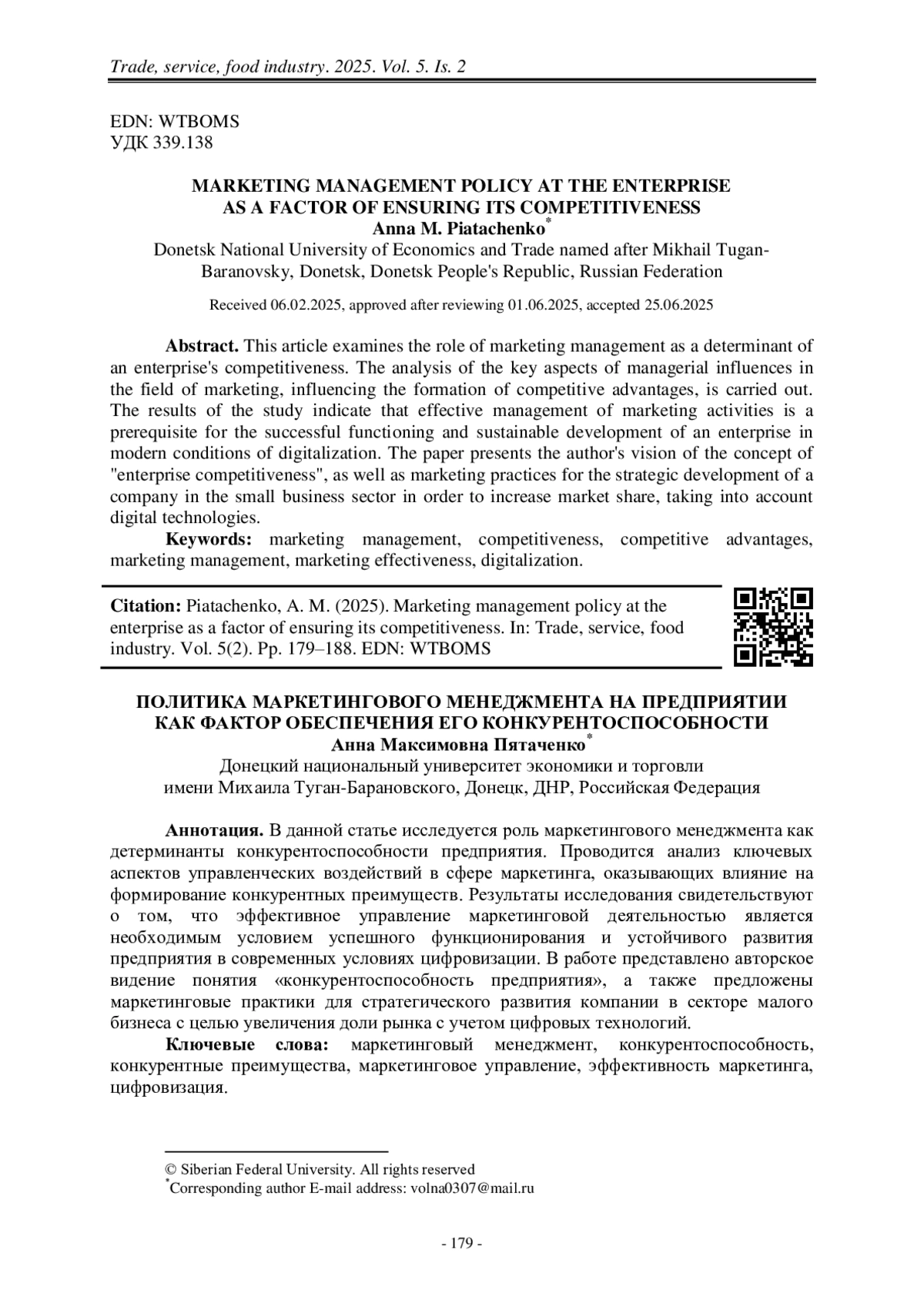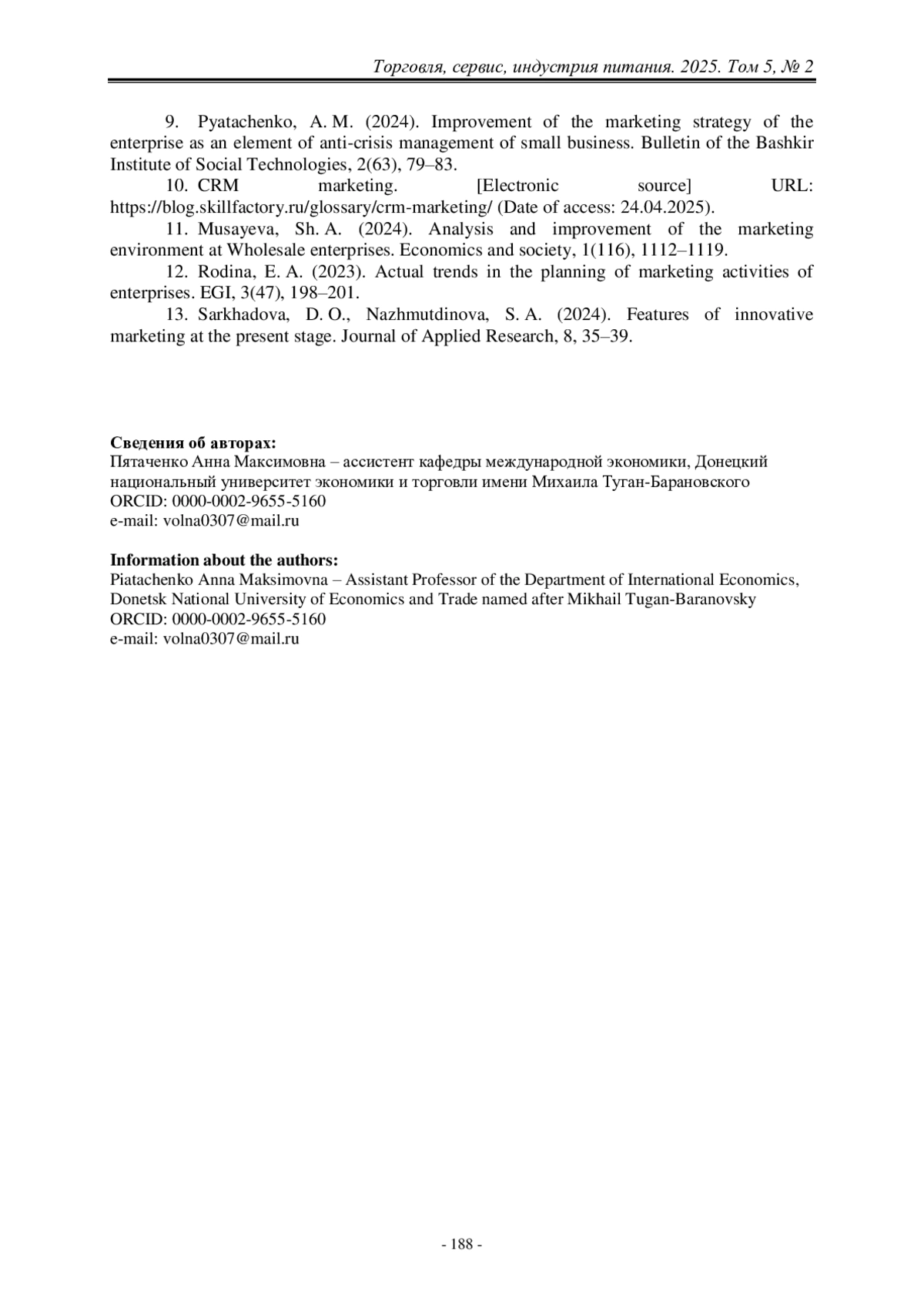 9. Пятаченко, А. М. Совершенствование маркетинговой стратегии предприятия как элемент антикризисного управления малым бизнесом [Текст] / А. М. Пятаченко // Вестник Башкирского института социальных технологий. – 2024. – № 2(63). – С. 79–83.