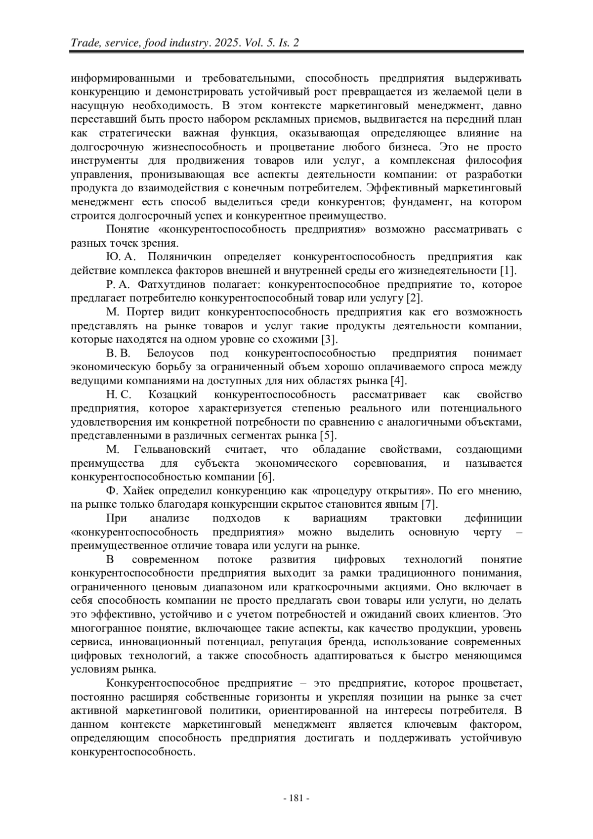 В данной статье исследуется роль маркетингового менеджмента как детерминанты конкурентоспособности предприятия. Проводится анализ ключевых аспектов управленческих воздействий в сфере маркетинга, оказывающих влияние на формирование конкурентных преимуществ. Результаты исследования свидетельствуют о том, что эффективное управление маркетинговой деятельностью является необходимым условием успешного функционирования и устойчивого развития предприятия в современных условиях цифровизации. В работе представлено авторское видение понятия «конкурентоспособность предприятия», а также предложены маркетинговые практики для стратегического развития компании в секторе малого бизнеса с целью увеличения доли рынка с учетом цифровых технологий.