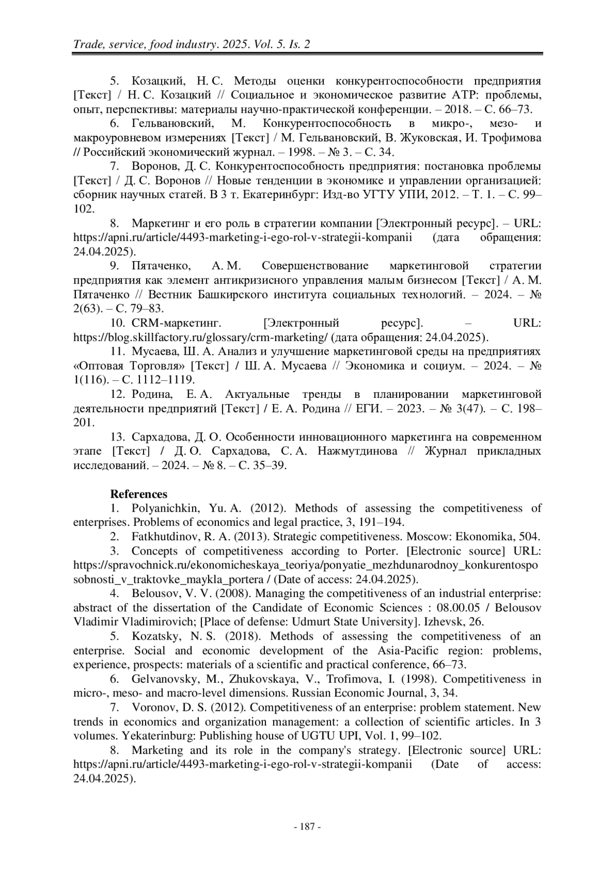 6. Гельвановский, М. Конкурентоспособность в микро-, мезо- и макроуровневом измерениях [Текст] / М. Гельвановский, В. Жуковская, И. Трофимова // Российский экономический журнал. – 1998. – № 3. – С. 34.
