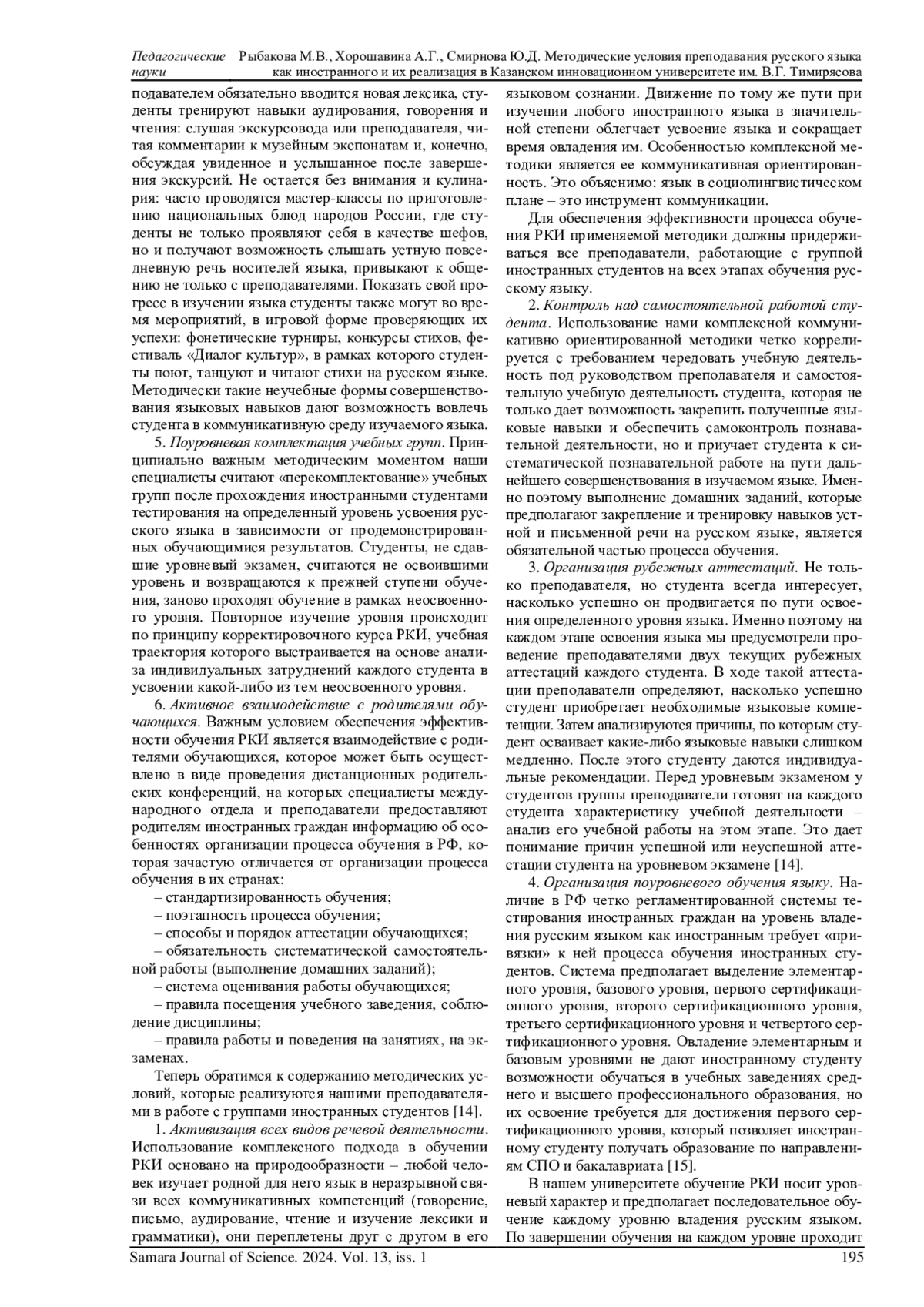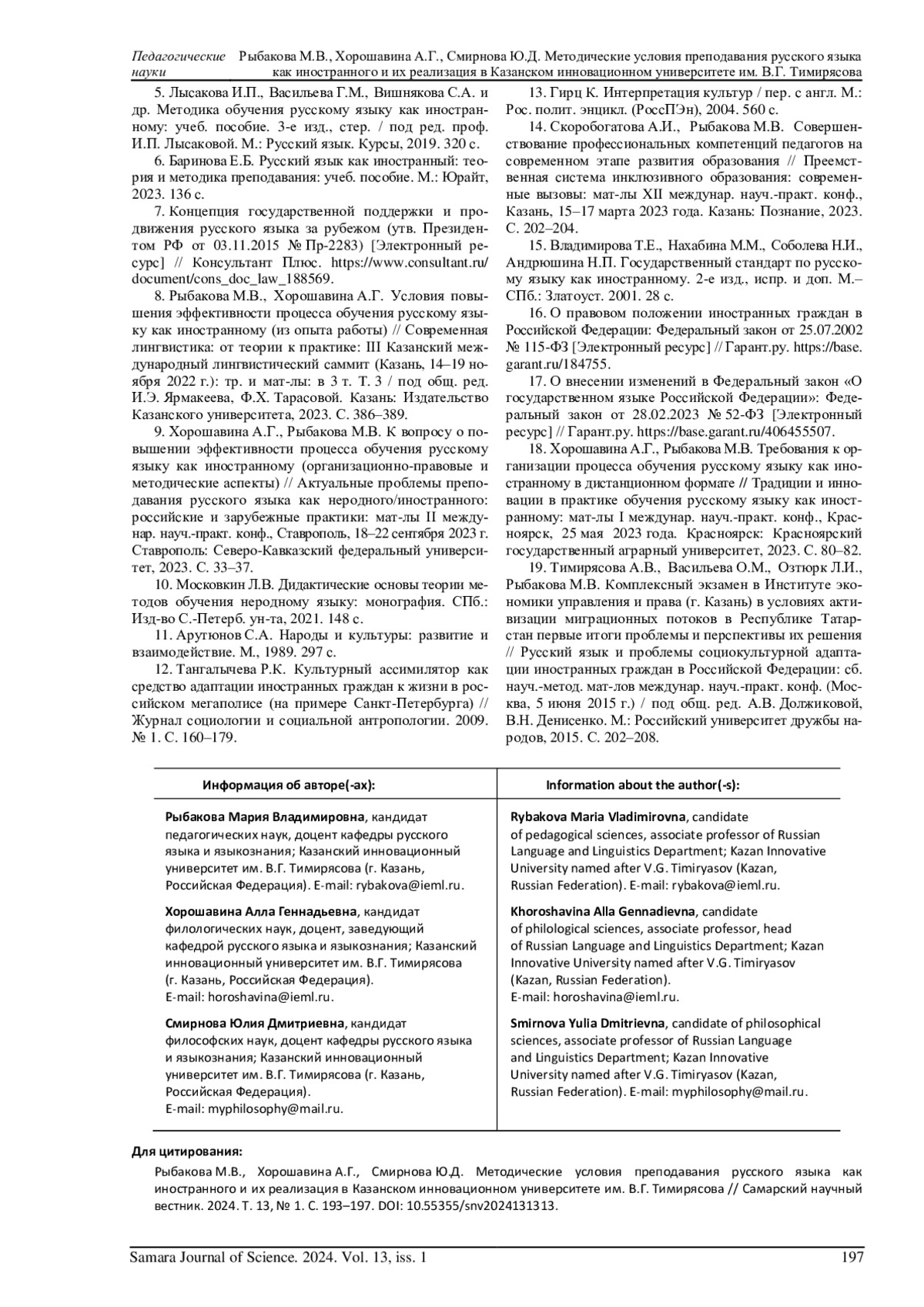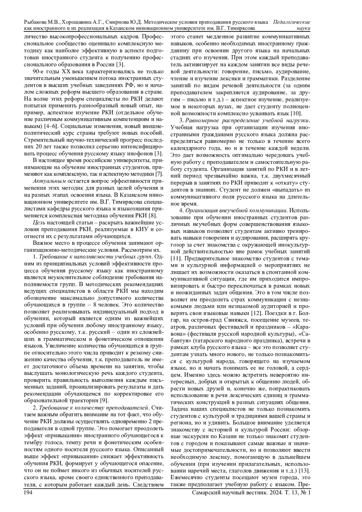 РЫБАКОВА М. В., ХОРОШАВИНА А. Г., СМИРНОВА Ю. Д. МЕТОДИЧЕСКИЕ УСЛОВИЯ ПРЕПОДАВАНИЯ РУССКОГО ЯЗЫКА КАК ИНОСТРАННОГО И ИХ РЕАЛИЗАЦИЯ В КАЗАНСКОМ ИННОВАЦИОННОМ УНИВЕРСИТЕТЕ ИМ. В. Г. ТИМИРЯСОВА // САМАРСКИЙ НАУЧНЫЙ ВЕСТНИК. 2024. ТОМ 13, № 1