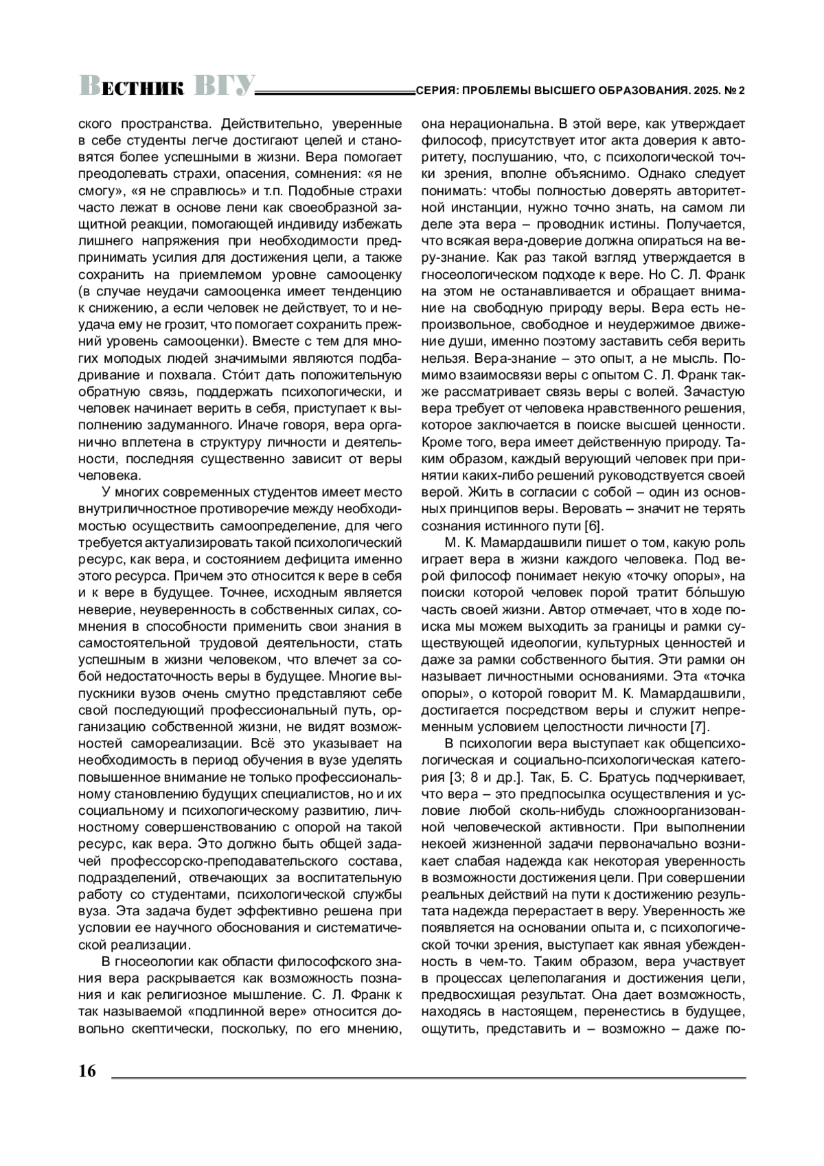 В статье обсуждается проблема такого психологического ресурса самоопределения в студенческом возрасте, как вера. Раскрывается сущность веры в ее психологическом смысле, многопредметность и многофункциональность веры как сложного личностного образования, пронизывающего сознание, деятельность, мотивационную и эмоционально-волевую сферы, описываются основные различия между религиозной и нерелигиозной верой. Определены некоторые направления воспитательной и психологической работы со студентами, испытывающими дефицит веры, что препятствует их эффективному самоопределению.