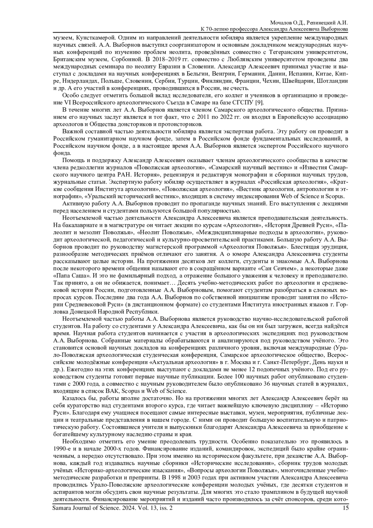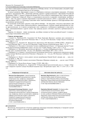 9. Мочалов О.Д., Выборнов А.А., Андреев К.М. VI Всероссийский археологический съезд в г. Самаре // Известия Самарского научного центра Российской академии наук. Исторические науки. 2022. Т. 4, № 3 (15). С. 139-141. EDN: YQCDVF