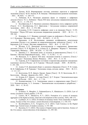 2. Леонов, М. В. Формирование системы денежных агрегатов в цифровой экономике [Текст] / М. В. Леонов, Н. В. Земцова // Инновационное развитие экономики. – 2021. – № 5(65). – С. 160–171.