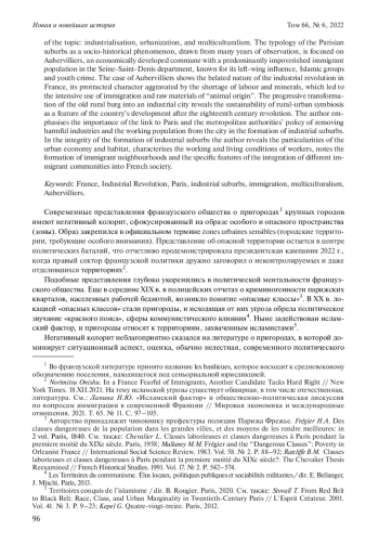 Заявленная тема находится на пересечении двух направлений научных исследований: промышленной революции во Франции и истории современных пригородов Парижа. Методологически это полидисциплинарное исследование, соединяющее экономическую историю, социальную антропологию и историческую географию. В источниковедческом плане преобладают краеведческие материалы. В статье раскрываются три аспекта темы в их взаимосвязи: индустриализация, урбанизация, мультикультурность. В качестве объекта типологии парижского пригорода как социально-исторического явления на основе многолетних наблюдений выбран Обервилье, экономически развитая коммуна с преобладанием бедного иммигрантского населения в департаменте Сена-Сен-Дени, известном влиянием левых сил, исламских группировок и молодежной преступностью. На примере Обервилье показана запоздалость промышленной революции во Франции, ее затяжной характер, отягощенный недостатком трудовых ресурсов и минерального сырья, что привело к интенсивному использованию иммиграции и сырья «животного происхождения». В поступательном превращении старинного сельского бурга в промышленный город выявляется устойчивость сельско-городского симбиоза как специфика развития страны после революции XVIII в. Подчеркивается значение связи с Парижем и политики столичных властей, направленной на удаление из города вредных производств и рабочего населения, в образовании промышленных пригородов. В целостности формирования промышленного пригорода автор раскрывает специфику городской экономики и среды обитания, характеризует условия труда и быта рабочих, отмечает формирование иммигрантских кварталов и особенности интеграции различных иммигрантских общин во французское общество