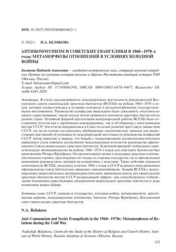 4. Белякова Н.А. Церкви в холодной войне // Государство, религия, церковь в России и за рубежом. 2017. № 1. С. 7-18. EDN: YLYKEB