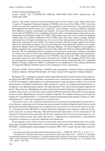 В статье рассматривается международная деятельность руководителей Всесоюзного совета евангельских христиан-баптистов (ВСЕХБ) на рубеже 1960–1970-х годов, которая осуществлялась в условиях контроля и регламентирования государственными инстанциями. Руководство конфессии вынуждено было доказывать «полезность» своего существования; такую пользу могли приносить контакты христиан-баптистов из разных стран. Основной формой презентации международной работы ВСЕХБ было составление отчетов как о зарубежных командировках, так и об общении с иностранцами внутри СССР. Эти отчеты направлялись в Совет по делам религий при Совете министров СССР, где на их основе составлялись обобщающие аналитические записки для вышестоящих инстанций об успешности международной деятельности руководства конфессий СССР. Автор приходит к выводу, что борьба с международным антикоммунистическим движением стала поводом для развития международных контактов руководства официального Союза евангельских христиан-баптистов. Ключевой фигурой глобального евангелического антикоммунизма на рубеже 1960–1970-х годов для советских баптистов был проповедник Ричард Вурмбранд. Он организовывал акции в поддержку христиан в коммунистических странах, преследуемых не только со стороны государства, но и официальным церковным руководством, идущим на компромисс с властями. Такие действия угрожали легитимности ВСЕХБ, поскольку в начале 1960-х годов в СССР возникло оппозиционное официальному союзу баптистское движение «инициативников». Борьба ВСЕХБ с международным евангелическим антикоммунистическим движением имела для евангельских христиан-баптистов внутри СССР неожиданный эффект: она способствовала стабилизации положения существующих объединений евангельских христиан-баптистов и даже появлению новых общин.