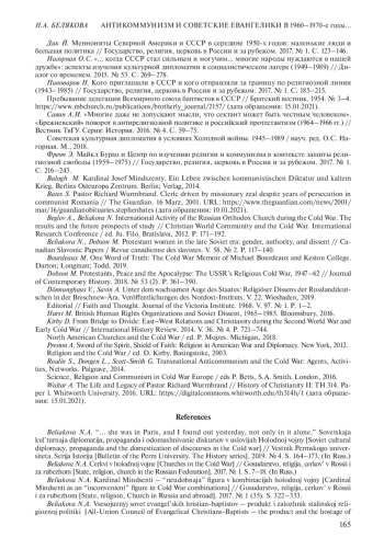 16. Beglov A., Beliakova N. International Activity of the Russian Orthodox Church during the Cold War. The results and the future prospects of study // Christian World Community and the Cold War. International Research Conference / ed. Ju. Filo. Bratislava, 2012. P. 171-192.