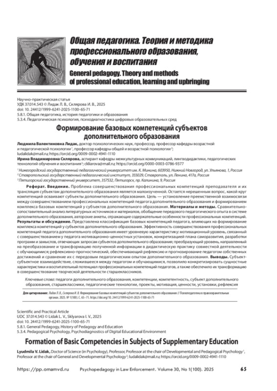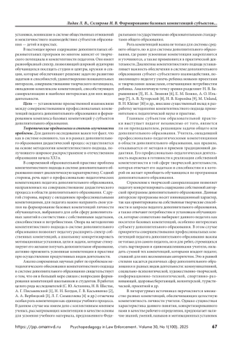 Проблема совершенствования профессиональных компетенций преподавателя и их трансляция субъектам дополнительного образования является малоизученной. Остается нерешенным вопрос, какой круг компетенций осваивают субъекты дополнительного образования. Цель — установление преемственной взаимосвязи между совершенствованием профессиональных компетенций педагога дополнительного образования и формированием комплекса базовых компетенций у субъектов дополнительного образования. Материалы и методы. Сравнительносопоставительный анализ литературных источников и материалов, обобщение передового педагогического опыта в системе дополнительного образования, авторские анкеты, отражающие содержательные особенности профессиональных компетенций. Результаты и обсуждение. Представлена классификация базовых компетенций педагога, влияющих на формирование комплекса компетенций у субъектов дополнительного образования. Эффективность совершенствования профессиональных компетенций педагога дополнительного образования имеет уровневую характеристику: мотивационный уровень, связанный с совершенствованием у педагога мотивационно-ценностных установок, конкретизацией плана саморазвития, разработки программ и замыслов, отвечающих запросам субъектов дополнительного образования; преобразующий уровень, направленный на преобразование и трансформацию полученной информации в дидактическую практику совместной деятельности с обучающимися; рефлексивно-прогностический, обеспечивающий рефлексию и прогнозирование педагогом собственных достижений и сравнение их с передовым педагогическим опытом дополнительного образования. Выводы. Субъектсубъектное взаимодействие, сложившееся между педагогом и обучающимися, позволило конкретизировать сущностные характеристики и воспитательный потенциал профессиональных компетенций педагогов, а также обеспечило их трансформацию в совершенствование творческой деятельности старшеклассников.