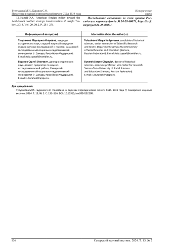 Рассматривается процесс формирования оценок ситуации в Палестине в периодической печати США. Материалы периодической печати позволяют установить, как в информационном дискурсе США менялись представления о причинах кризиса; как шел процесс эволюции образа Великобритании как союзника и Великобритании как конкурента. Публикации американских газет позволяют определить оценки британских мер по урегулированию кризиса 1939 г. Анализ газет США демонстрирует особенности формирования образа еврейского и арабского населения Палестины и кто попадал под категорию «свой». Период 1939 г. стал одним из определяющих для общественного мнения США в выборе приоритетов в ближневосточном конфликте. Материал статьи наглядно иллюстрирует этапы эволюции оценок американской периодической печати кризиса 1939 г. применительно к международной ситуации на Ближнем Востоке перед началом Второй мировой войны. Газеты США демонстрируют процесс изменений в представлениях американского общества о кризисе в Палестине 1939 года. Вторая мировая война стала одним из важных этапов в развитии дискуссии о ближневосточном конфликте, которая шла в американских газетах и журналах с начала XX века.