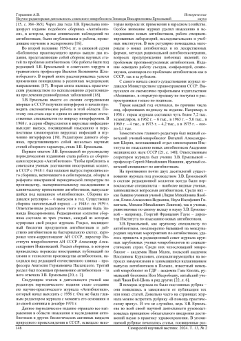 В данной статье впервые реконструируется неизвестная сторона в биографии видного советского ученого-микробиолога - академика медицины, профессора, доктора медицинских наук Зинаиды Виссарионовны Ермольевой (1898-1974), связанная с ее деятельностью по осуществлению редакционного руководства в издании сборников научных статей, периодических сборников переводов, обзоров и рефератов иностранной периодической литературы, а также научно-практического журнала «Антибиотики». Основной тематикой изданий, в которых З. В. Ермольева выступала в качестве научного редактора, была проблема антибиотиков (пенициллин, стрептомицин и ряд других) и интерферона. В качестве основных источников используются неопубликованные документы Государственного архива Российской Федерации и Российского государственного архива экономики, а также материалы сборников статей и периодических изданий, публиковавшихся в 1940-1970-е гг. под редакцией З. В. Ермольевой. В представленной публикации анализируется характер научных изданий и их тематическое наполнение. Характеризуется значение научно-практического журнала «Антибиотики» для науки и практики медицины, освещается характер его выпуска, публикации статей и география авторов и их учреждений, которые они представляли; рассматривается состав редакционной коллегии и редакционного совета, а также роль З. В. Ермольевой в руководстве журналом.