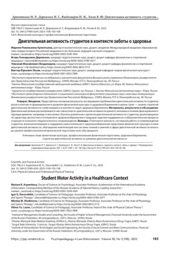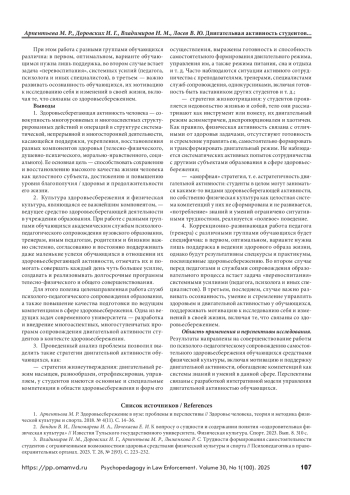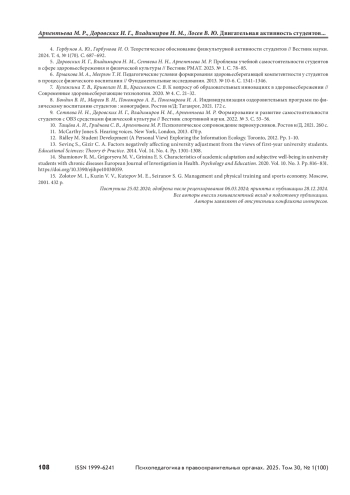 5. Доровских И. Г., Владимиров Н. М., Сетяева Н. Н., Арпентьева М. Р. Проблемы учебной самостоятельности студентов в сфере здоровьесбережения и физической культуры // Вестник РМАТ. 2023. № 1. С. 78–85.